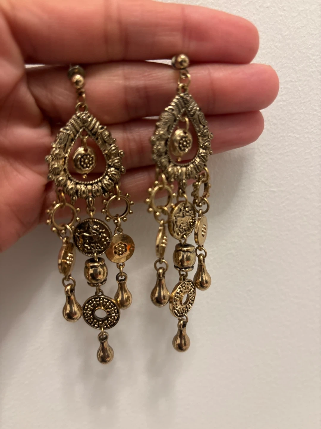35Selling a pair of gold-toned dangle earrings. They have a unique design with teardrop and coin-like details. These earrings are perfect for adding a touch of elegance to any outfit!