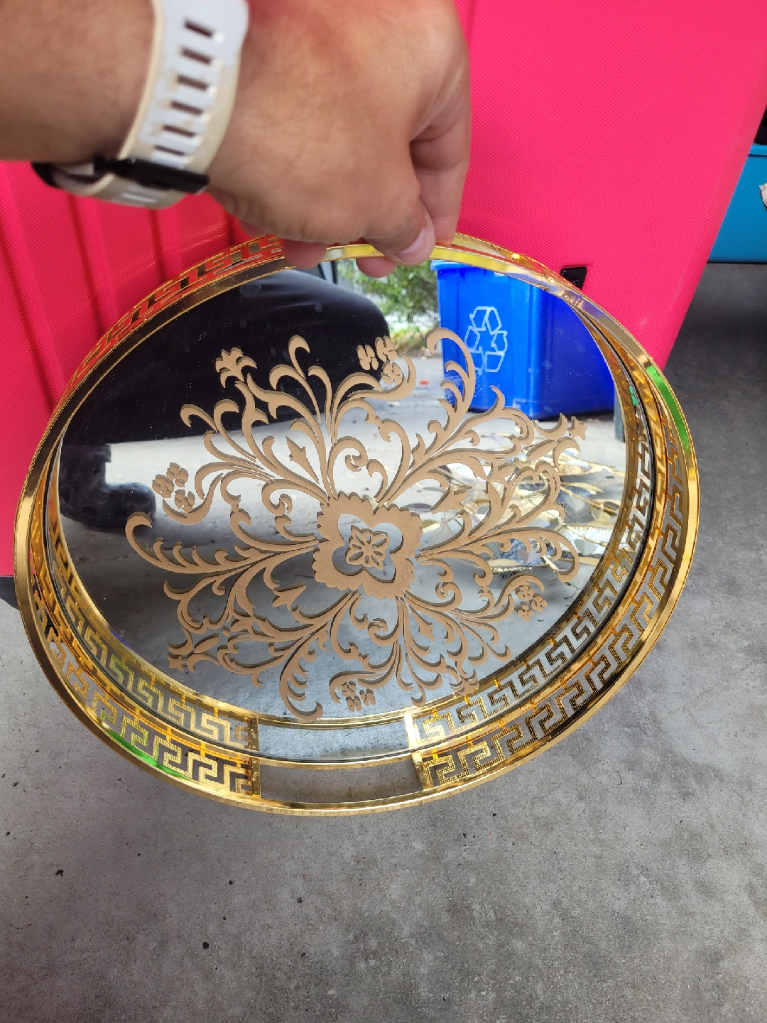 10Selling a lovely gold decorative tray with an ornate floral design, perfect for adding a touch of elegance to any room. Also included are some stylish wall decor pieces with gold accents to complement the tray. These items are great for enhancing your home decor! used for staging 10$ each.