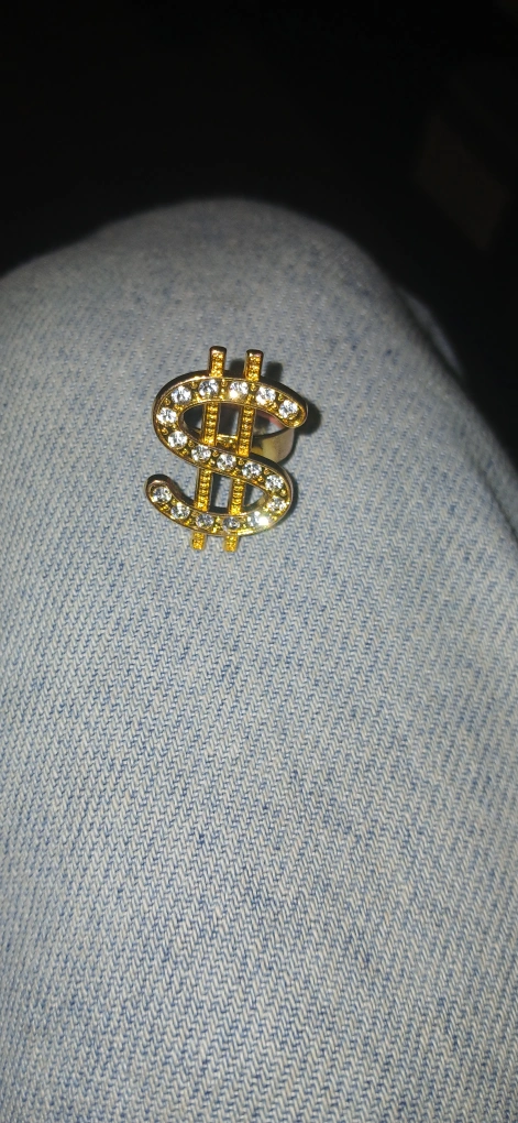 Selling a gold-coloured ring in the shape of a dollar sign. It has some small clear stones on it.