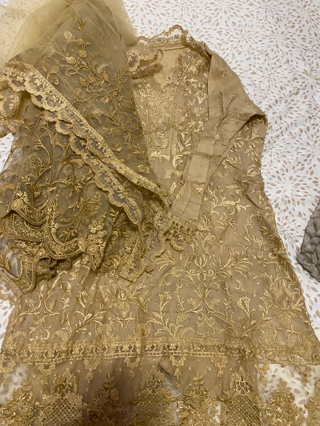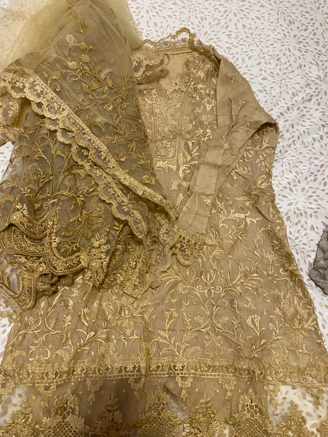 10Selling a beautiful gold embroidered dress, complete with a matching shawl. The intricate detailing and delicate lace trim make it perfect for a special occasion. It's in great condition and ready for a new home!