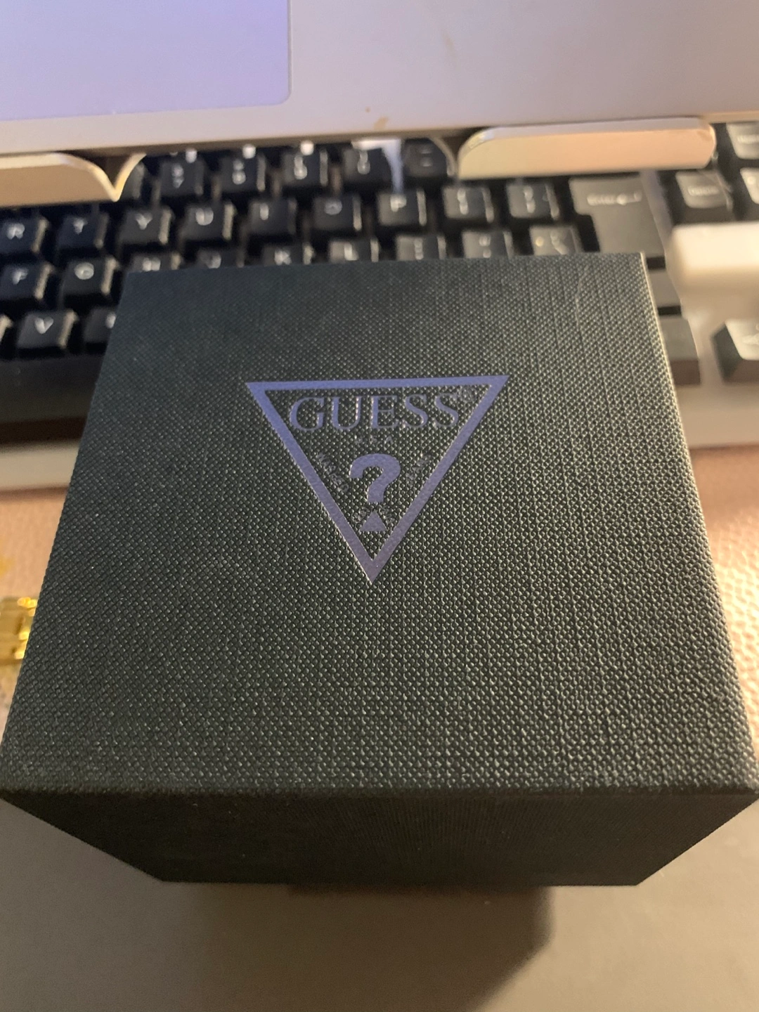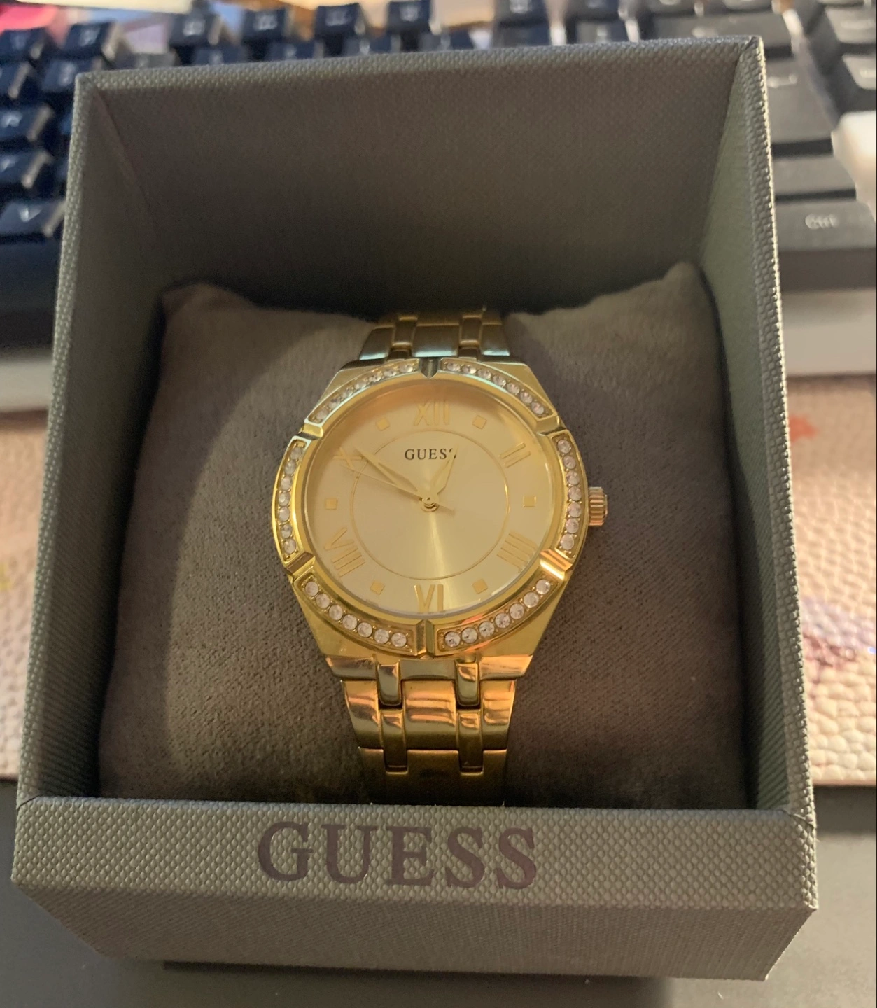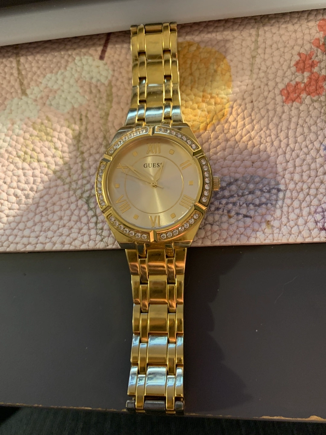 Women's gold Guess watch. Features a gold-tone bracelet and crystal accents. Comes in original box. ****has some scuff marks from wear as I wore it for a few months.