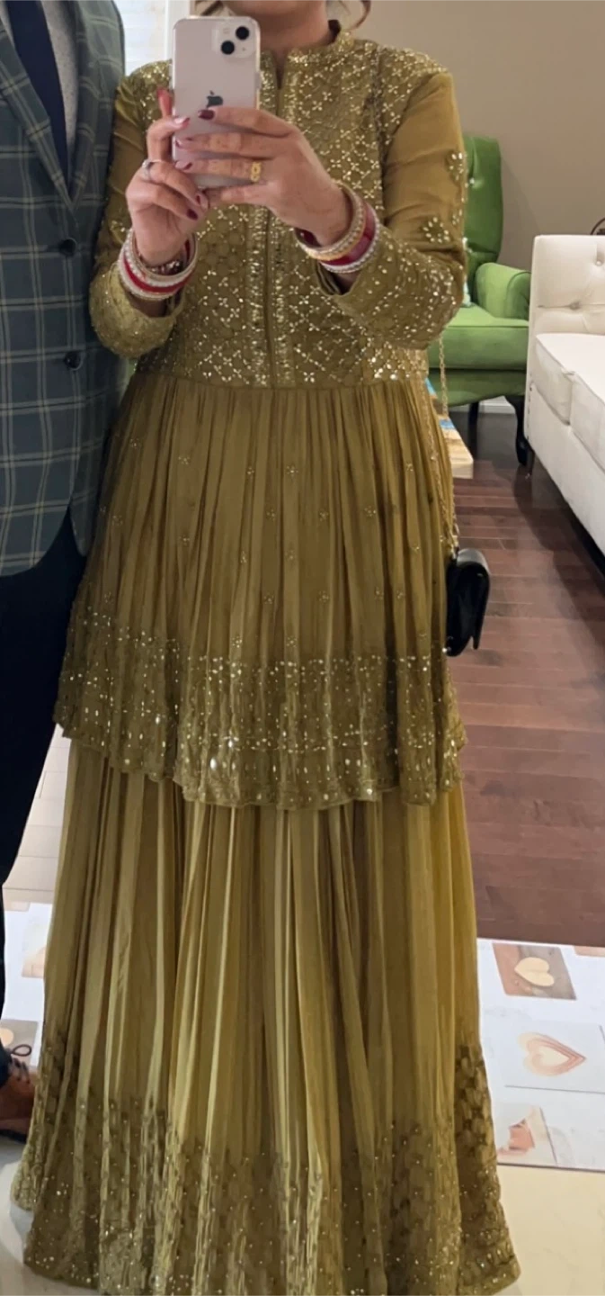 10Selling a beautiful gold (mehndi) Indian dress. It features intricate detailing and a tiered skirt. Perfect for a special occasion! Size - Medium worn only once