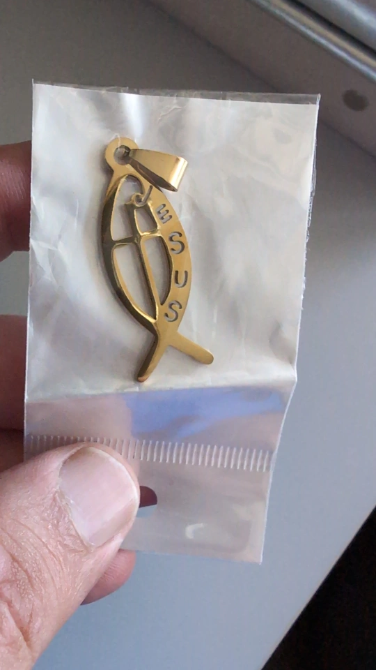 68Selling a brand new gold-coloured Jesus fish pendant. It's still in its original packaging and ready to go to a new home!