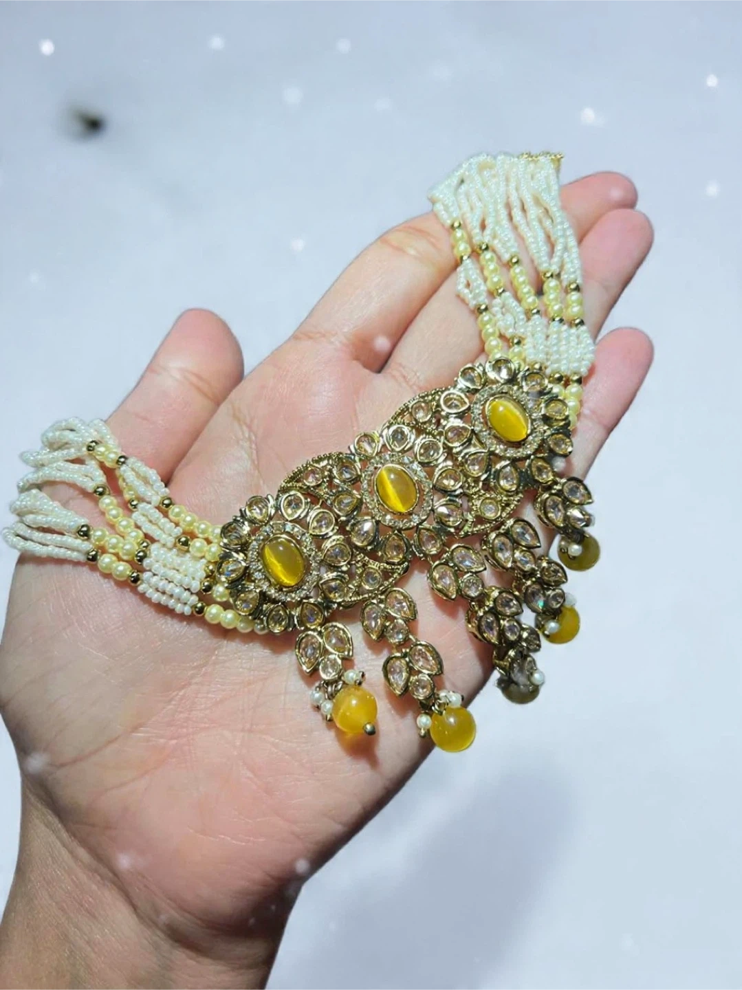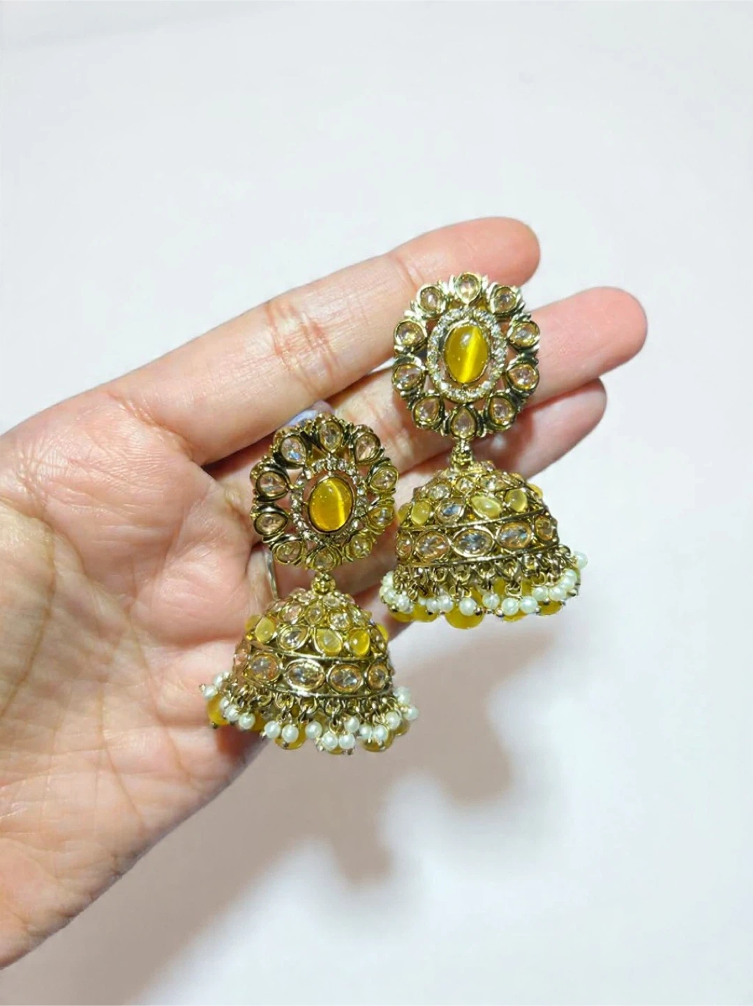 15Beautiful gold-toned jhumka earrings and necklace set! The set features intricate detailing with faux pearls and yellow stones, perfect for adding a touch of elegance to any outfit