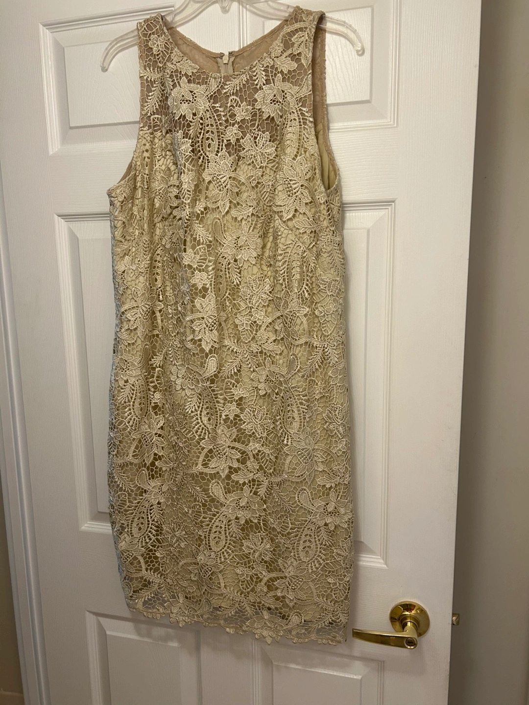A stunning gold lace dress. Sleeveless with a zipper closure. Perfect for a summer wedding. Original price 199.00