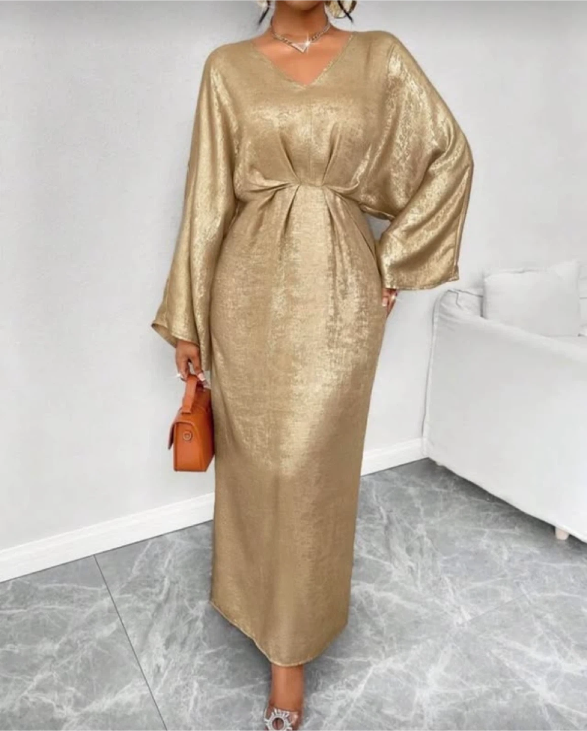 65A beautiful gold maxi dress, perfect for a special occasion! It features long sleeves and a flattering silhouette size Large
