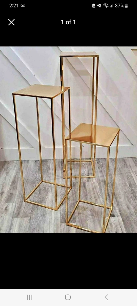 Three gold metal stands, different sizes. Perfect for displaying plants, decor, or other items.
