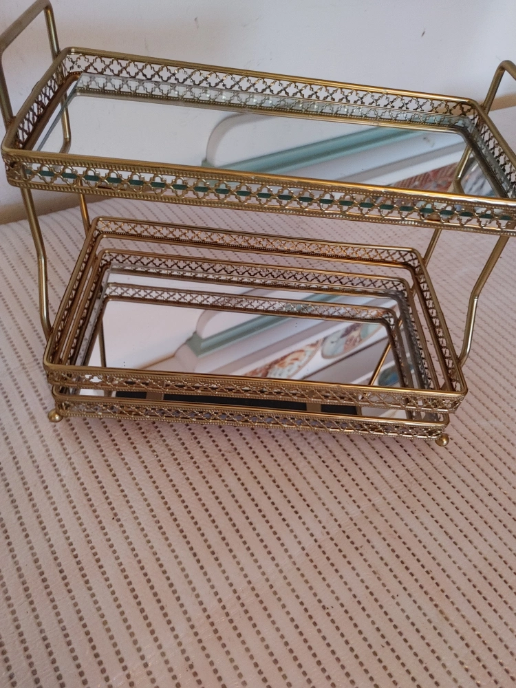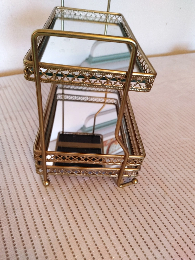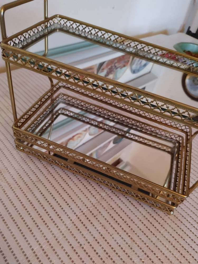 Selling a cute gold mirrored two-tier vanity tray. It's perfect for organizing your makeup, skincare, or other small items on your vanity or countertop. It adds a touch of glam to any space!