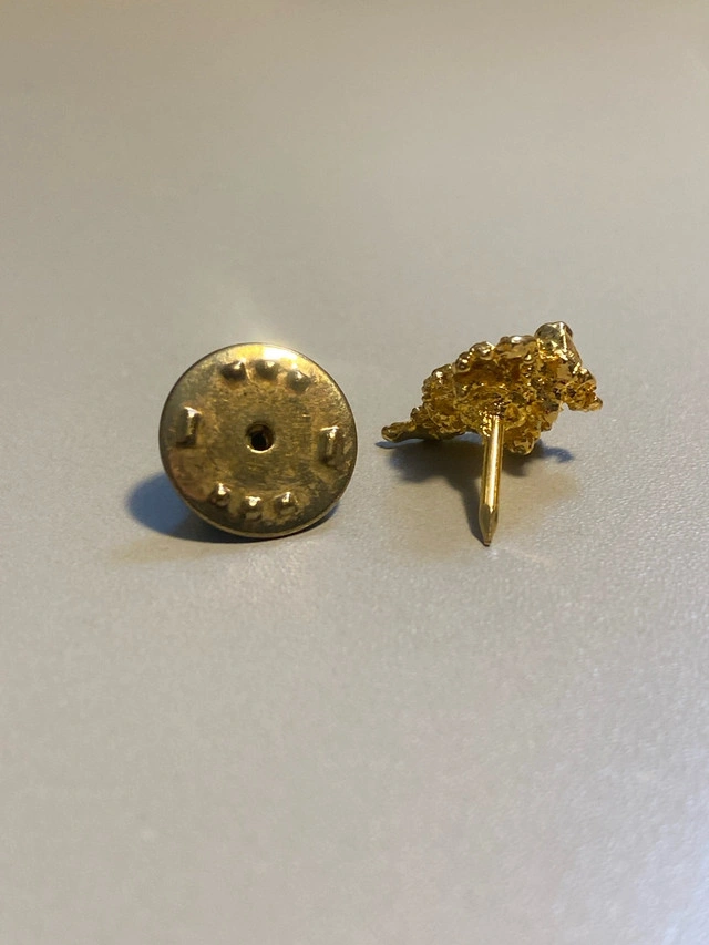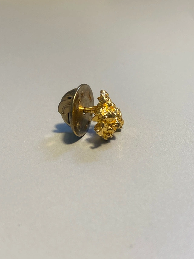 This is a vintage nugget pin. This unique accessory adds a touch of rustic elegance to any outfit, perfect for collectors or those who appreciate distinctive jewellery. It's in used condition, but still looks great! This little piece of gold-rush history could be yours for just $99! It's so shiny, you might need sunglasses.