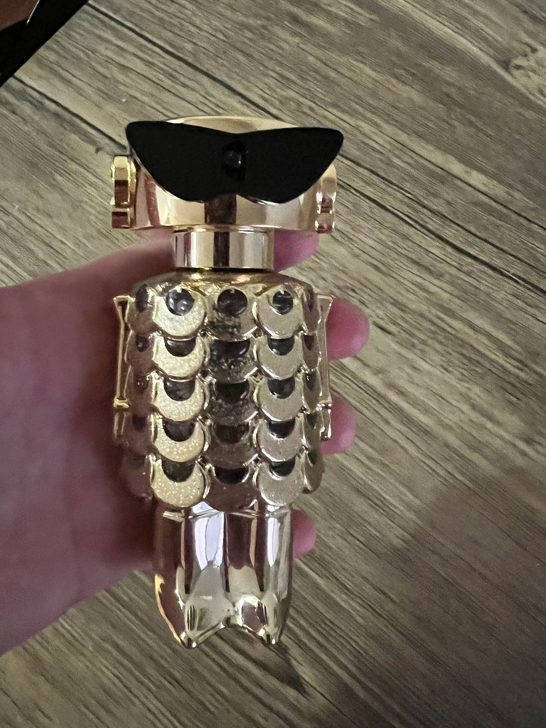 This is a gold perfume bottle with a black visor. It is in the shape of a robot with scales on the body. The bottle has a large opening at the top that is not attached to a sprayer.