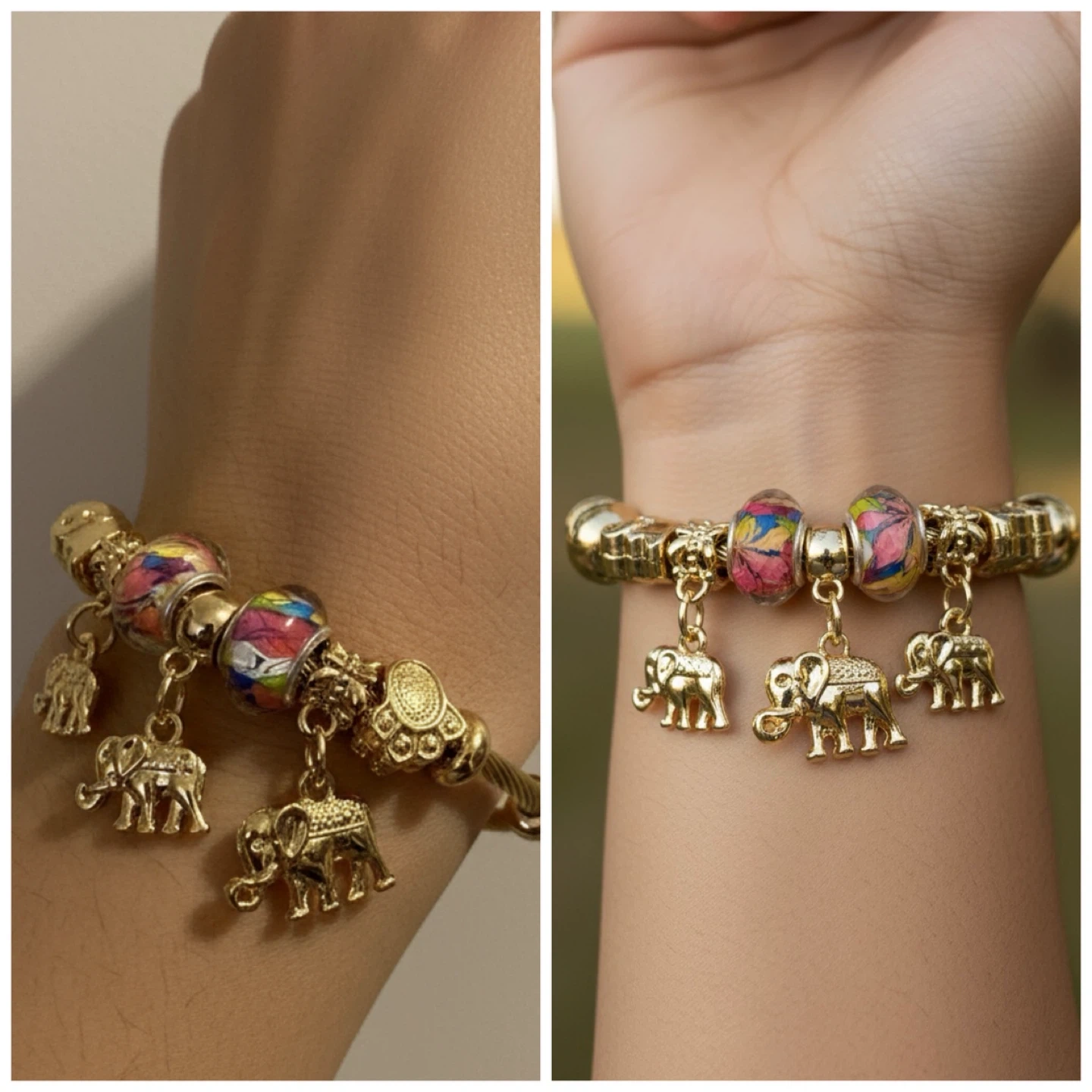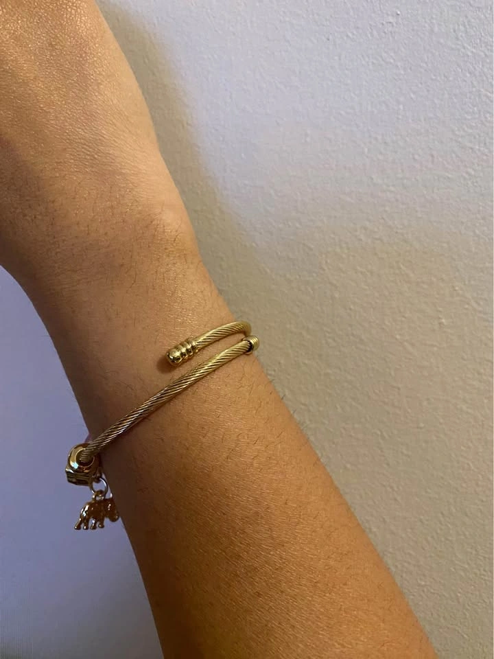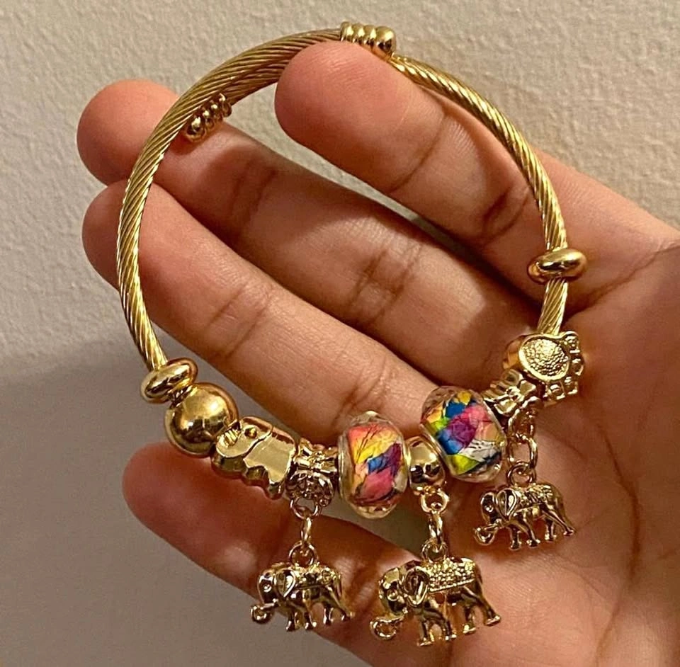 Add this unique gold plated stainless steel adjustable bangle bracelet with pink leafy synthetic crystal charms and adorable gold elephant charms to your jewelry collection! Would make a beautiful gift for Christmas, Valentine’s Day, Mother’s Day or for a loved one’s birthday.✨🐘 This item is brand new, unused.