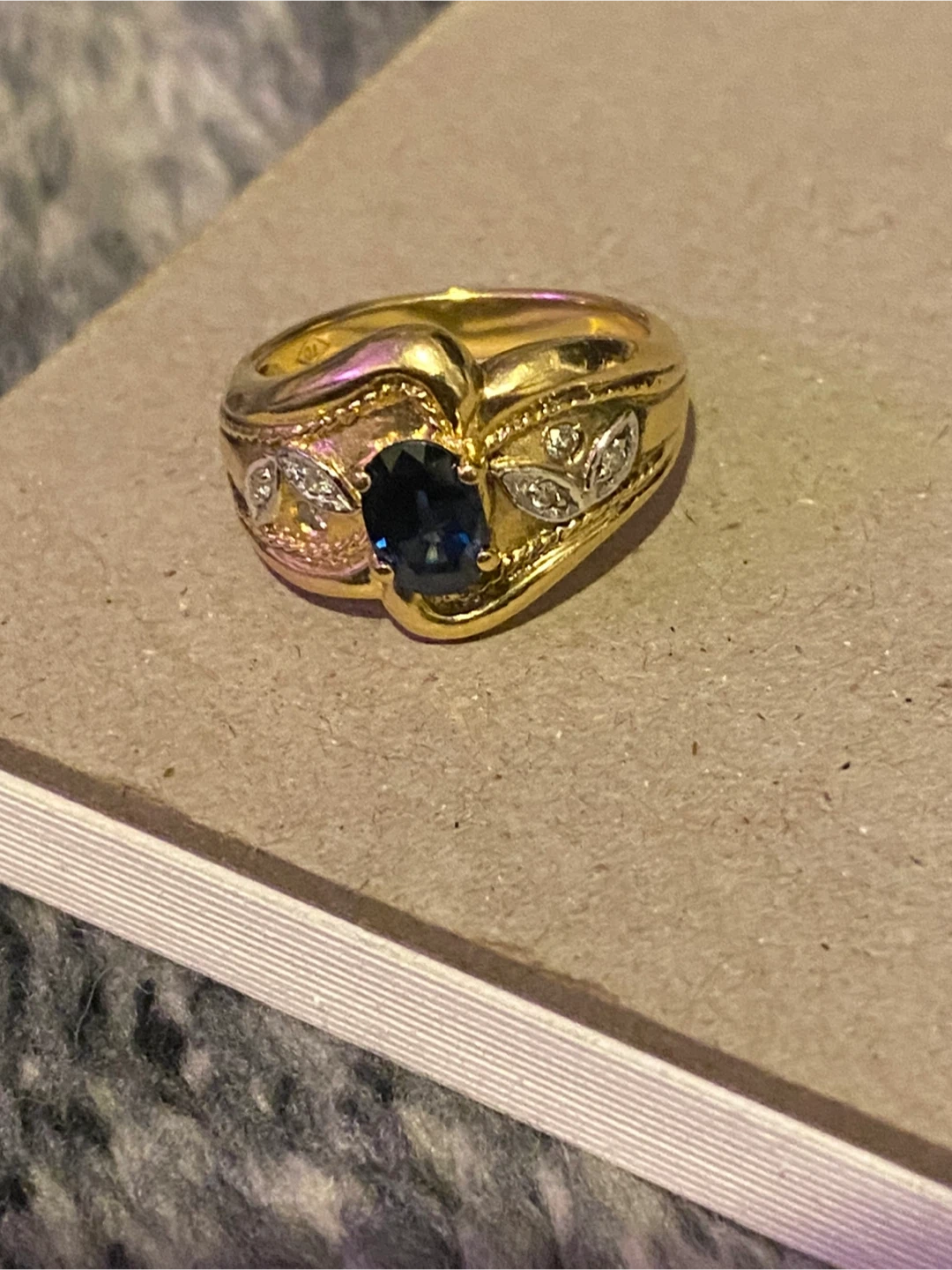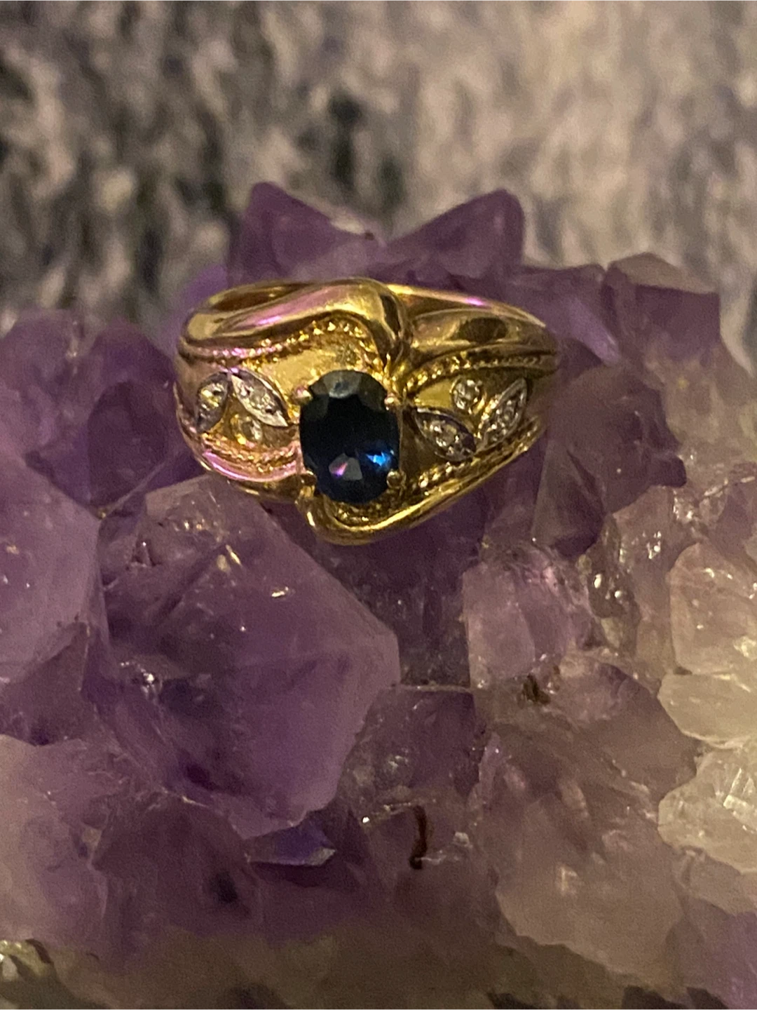 105Selling a gold 14 karat 5.8 gram ring size 6 featuring a striking blue stone. It has an intricate design with leaf-like patterns and small clear stones surrounding the centre. It would be a lovely addition to any jewelry collection!
