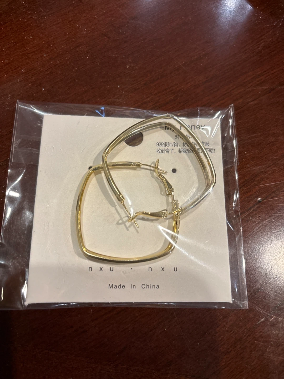 108Selling a pair of gold square hoop earrings. They are brand new and still in the original packaging. The earrings are made in China and feature a 925 silver needle/hook.