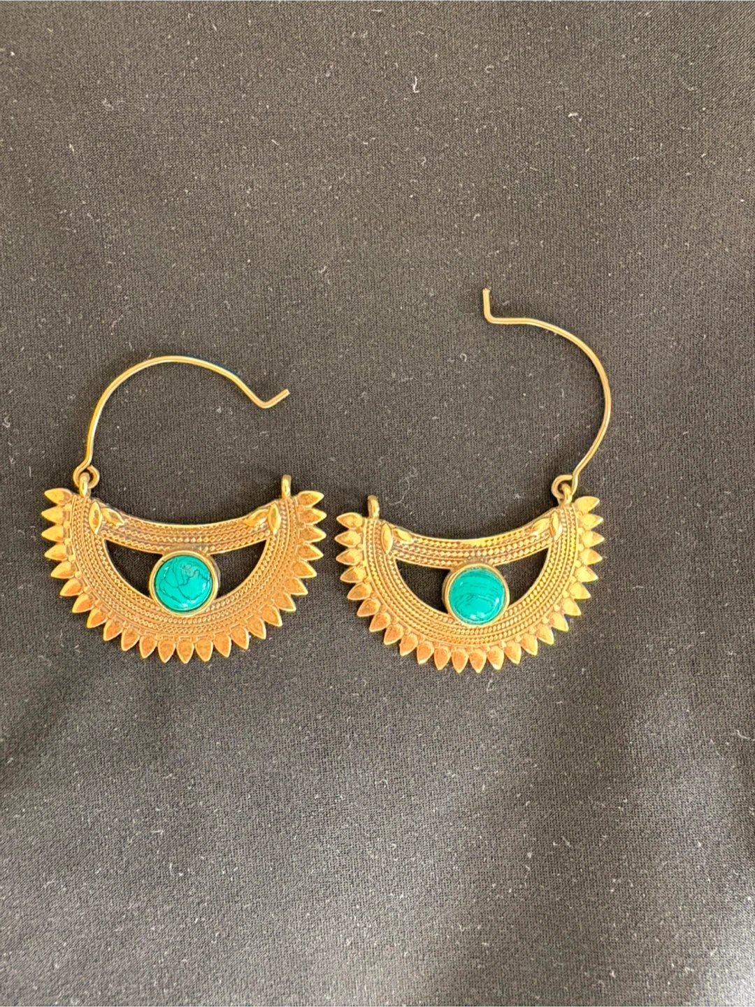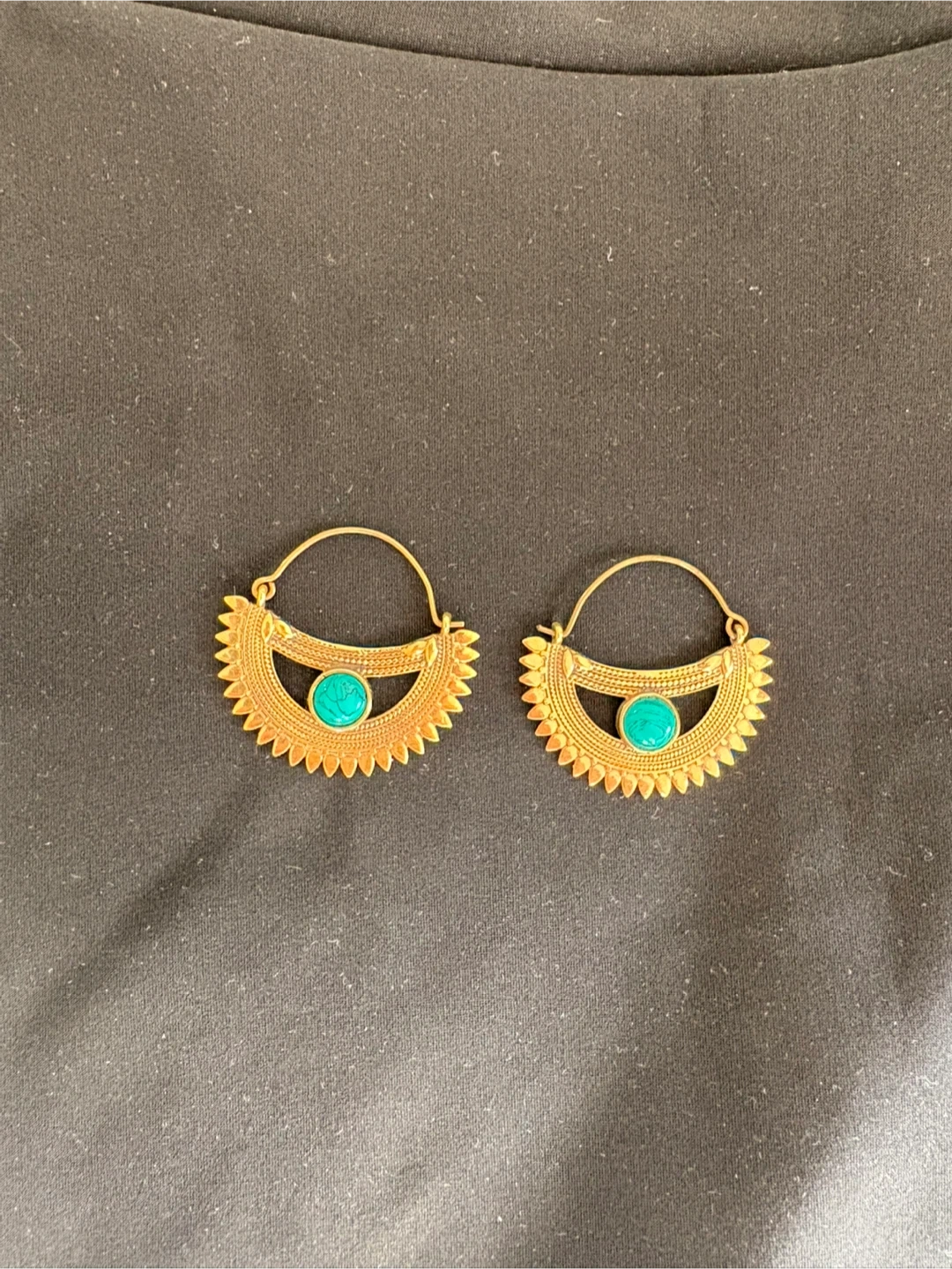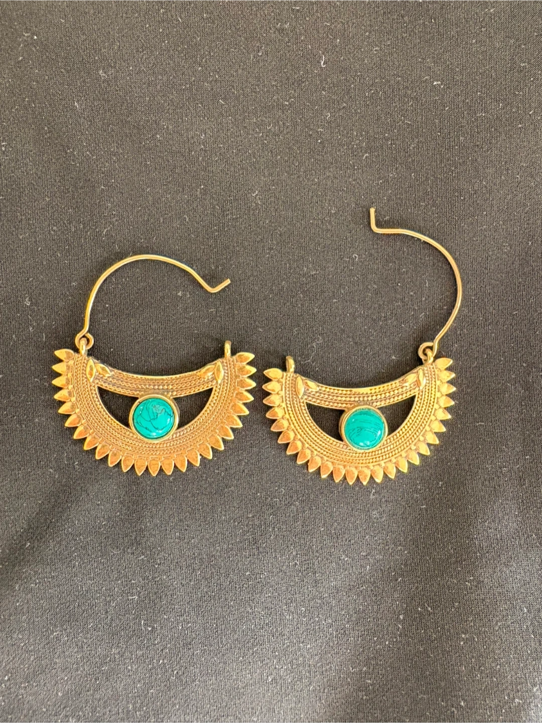 84These are a pair of gold-tone earrings featuring a unique design with a turquoise accent. They come in a box for safekeeping.