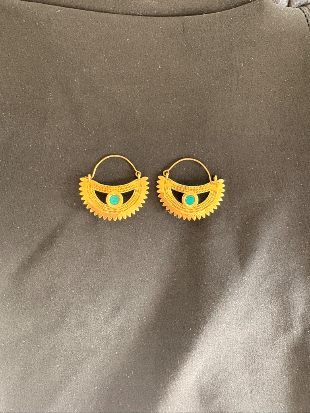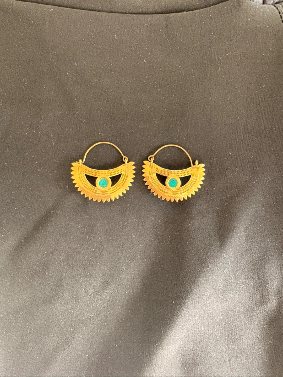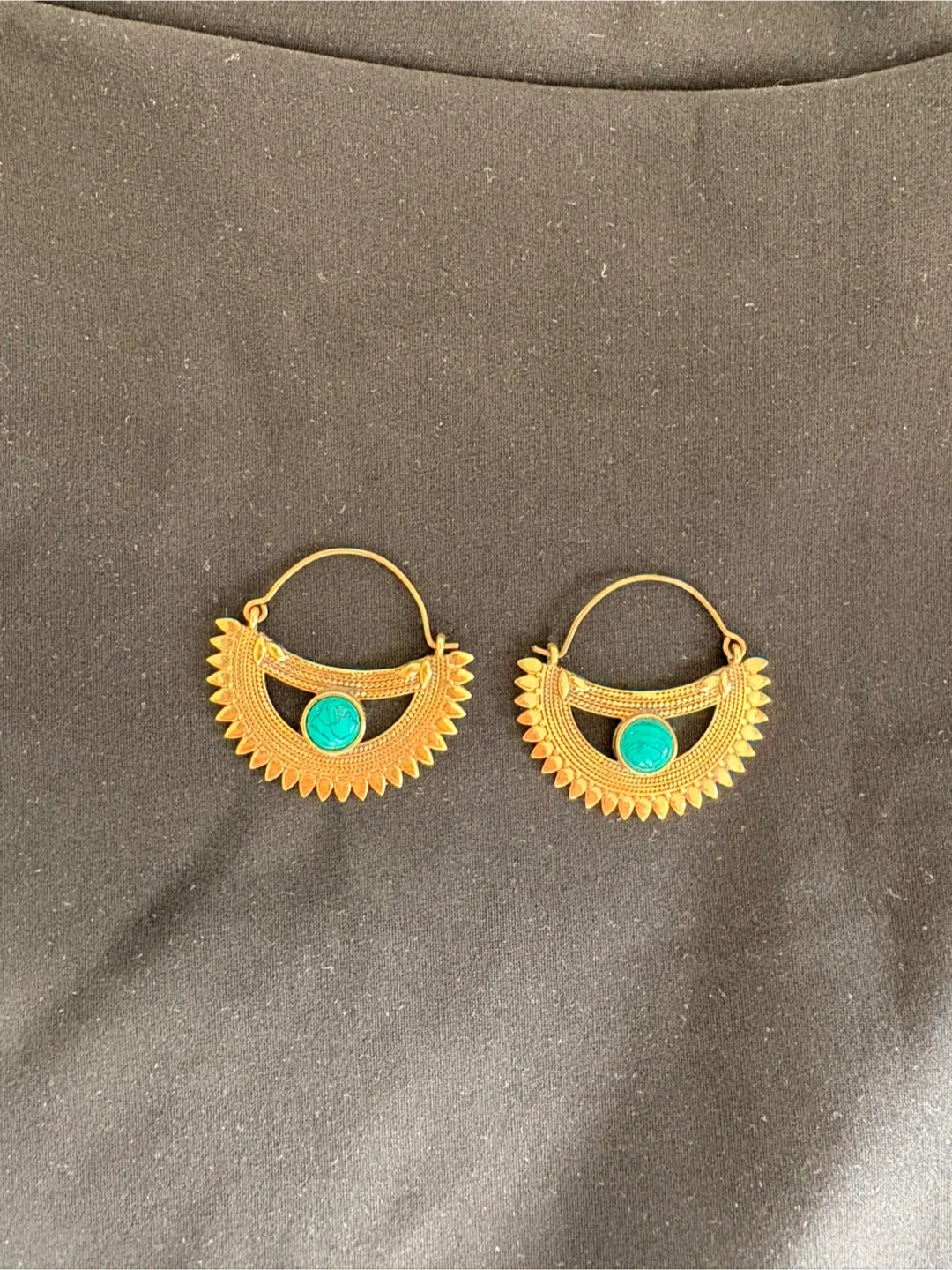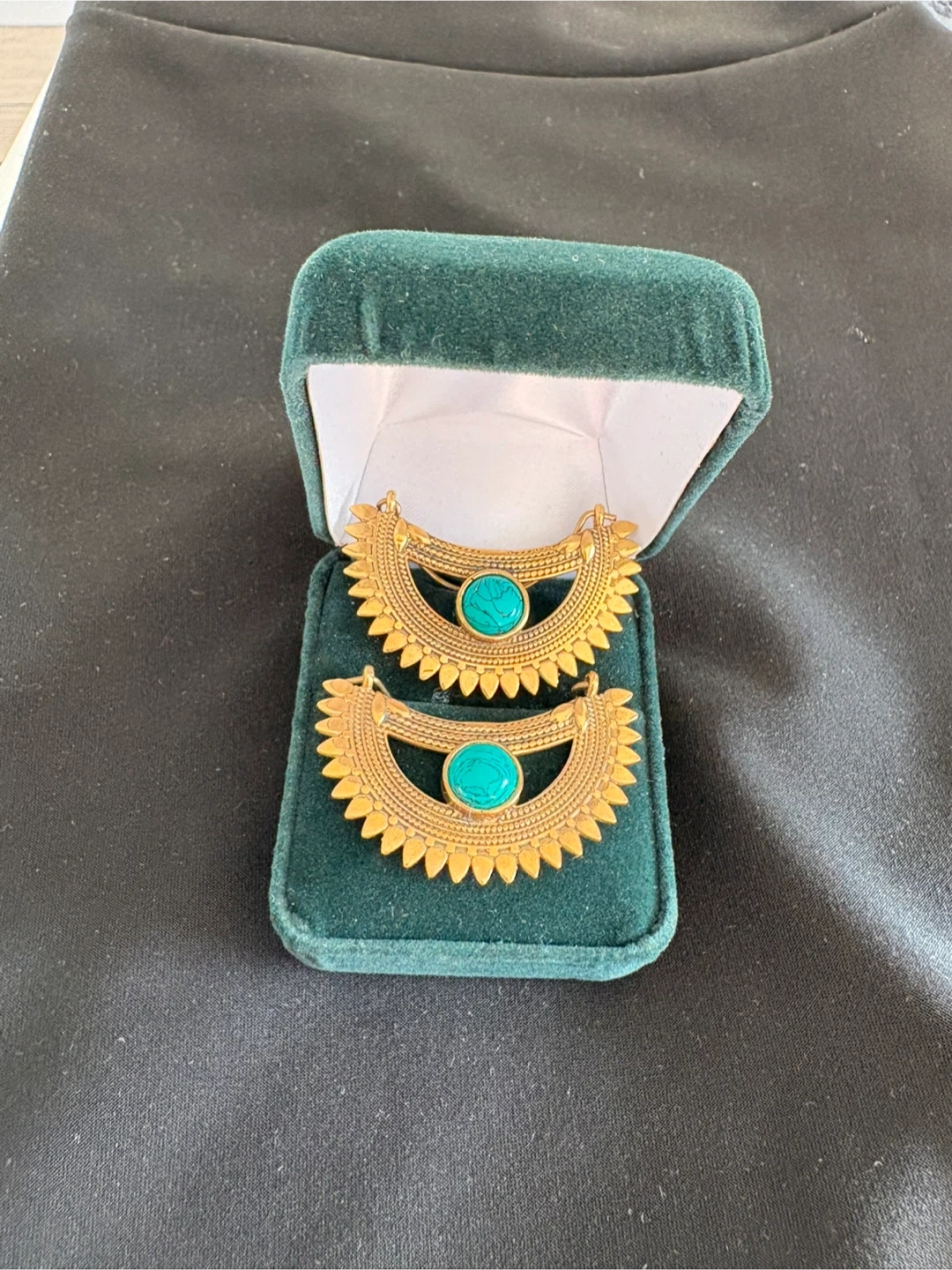 84These are a pair of gold-tone earrings featuring a unique design with a turquoise accent. They come in a box for safekeeping.