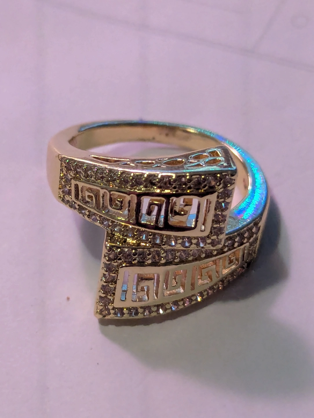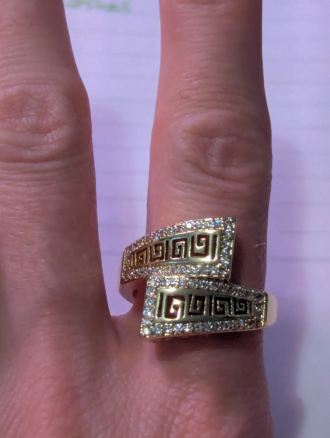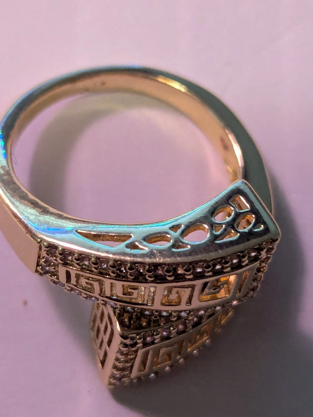 Elegant gold tone ring. Features a unique design with a Greek key pattern and sparkling cubic zirconia stones. Looks great worn alone or stacked with other rings.