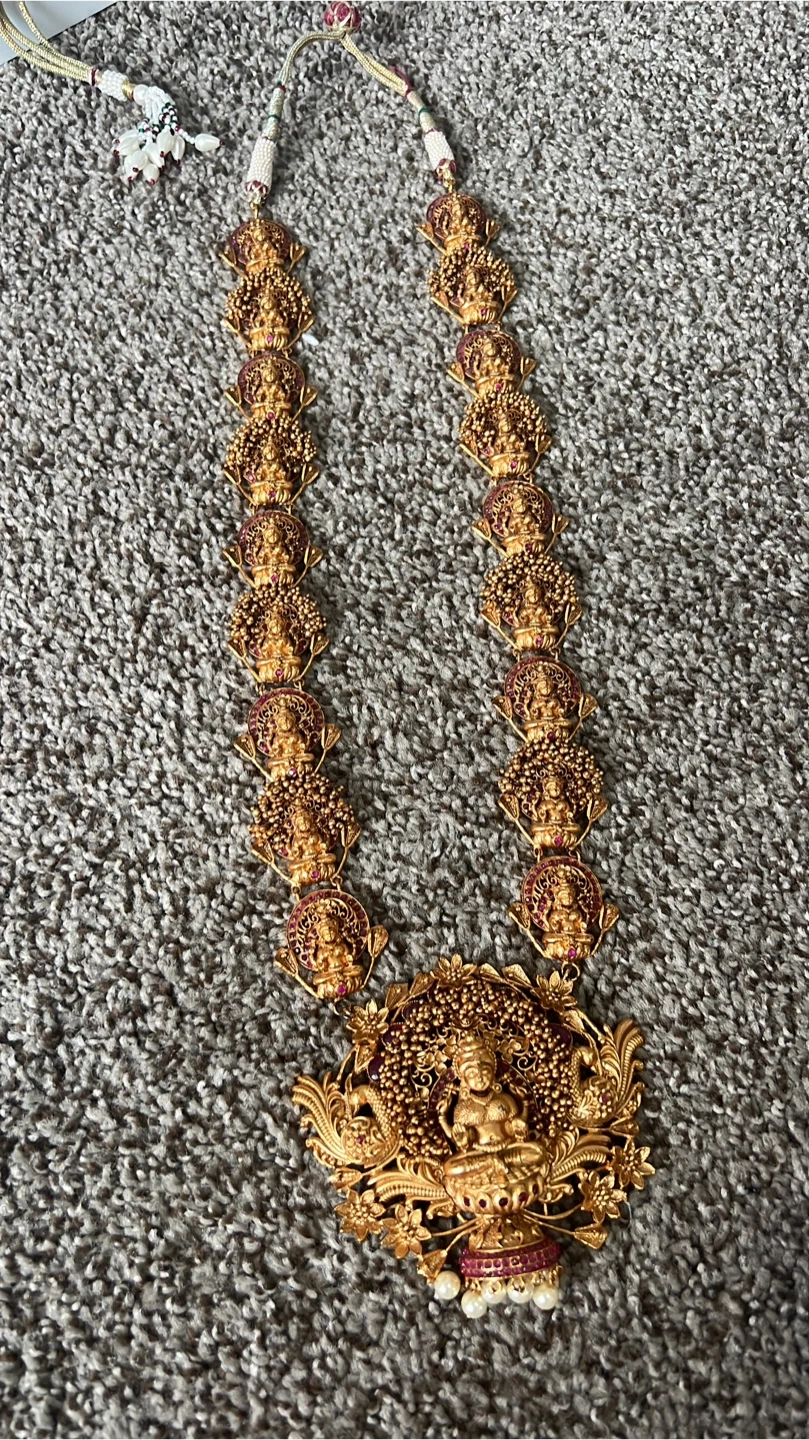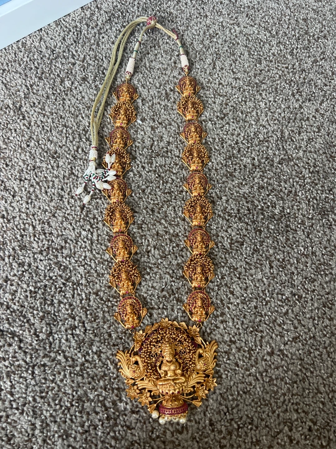 10Beautiful gold-tone necklace featuring Indian deities. This piece has intricate detailing and a unique design. Perfect for adding a touch of cultural elegance to any outfit
