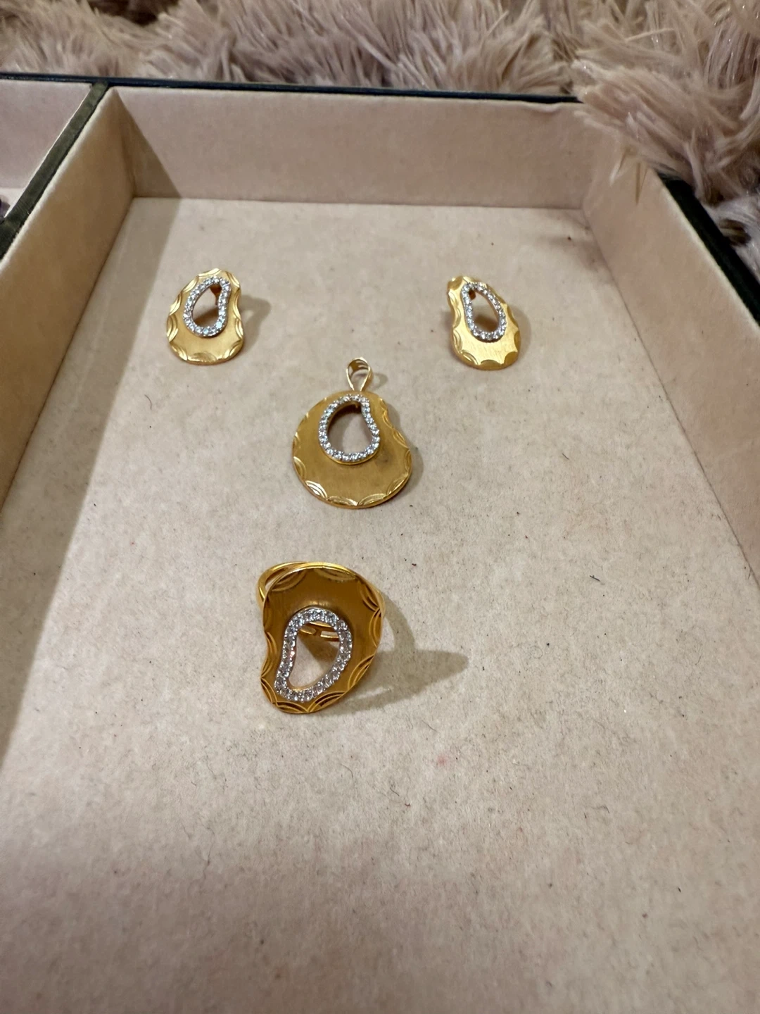97Selling a beautiful gold tone jewelry set that includes a ring, a pair of earrings, and a pendant. The set features a unique, organic design with sparkling accents. Perfect for adding a touch of elegance to any outfit!