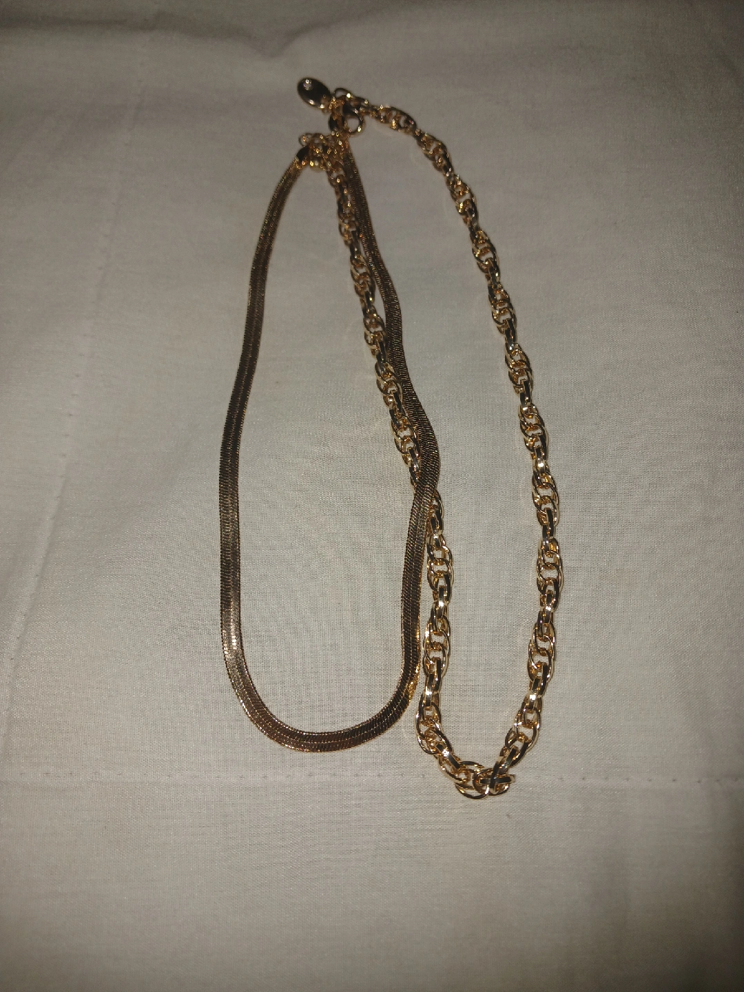 Selling a gold-tone layered chain necklace. It features two different chain styles for a trendy look. Perfect for adding a touch of sparkle to any outfit!