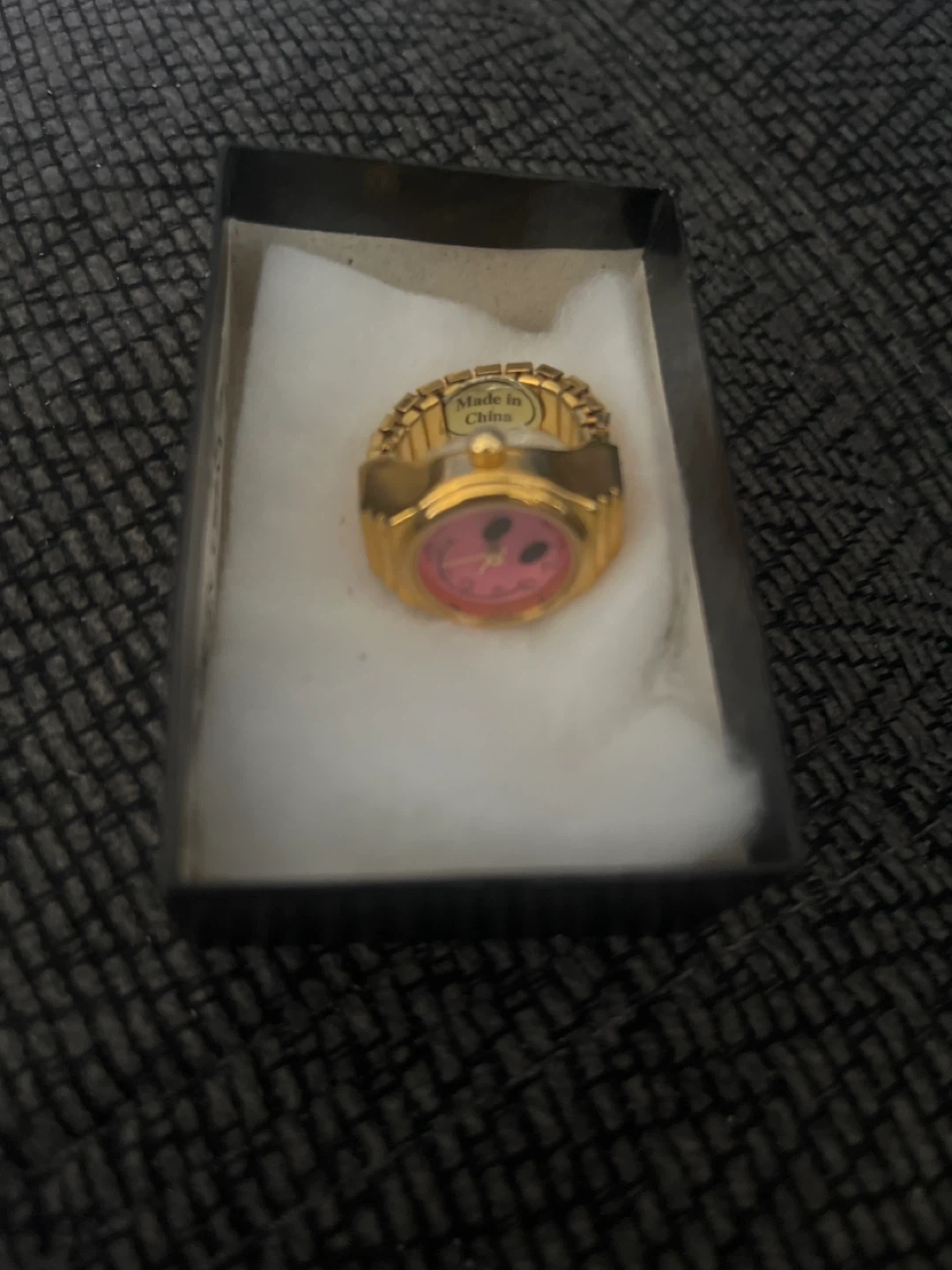 633Selling a cute gold tone ring with a pink smiley face design! It's brand new and comes in its original box. Perfect for adding a bit of fun to your jewelry collection