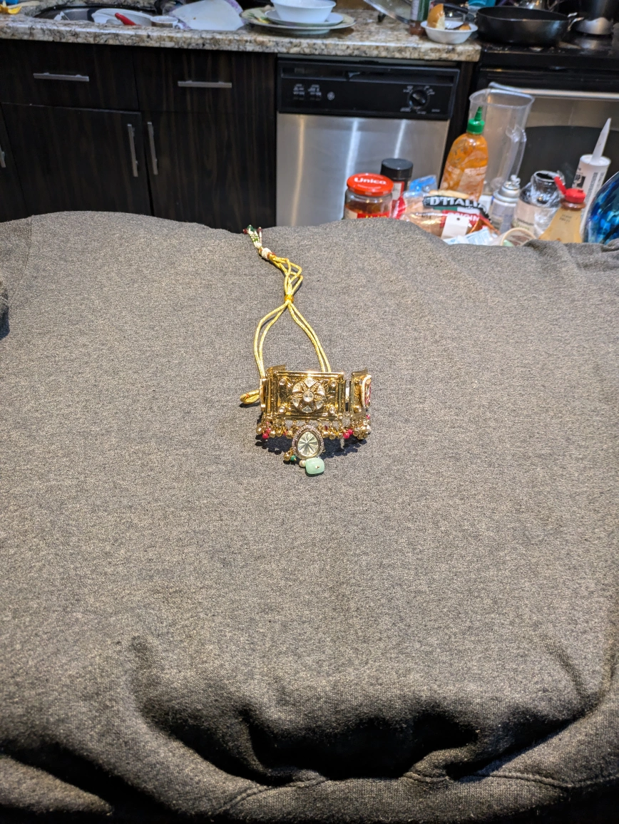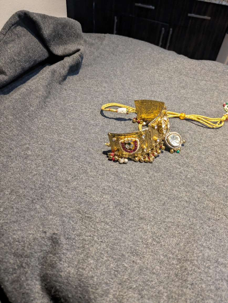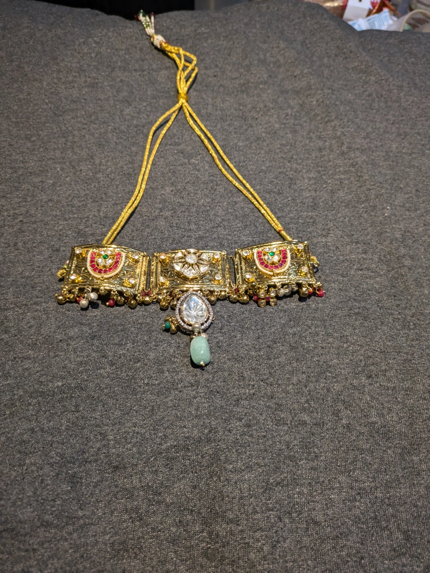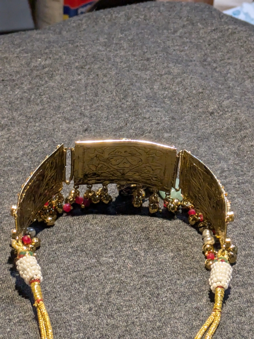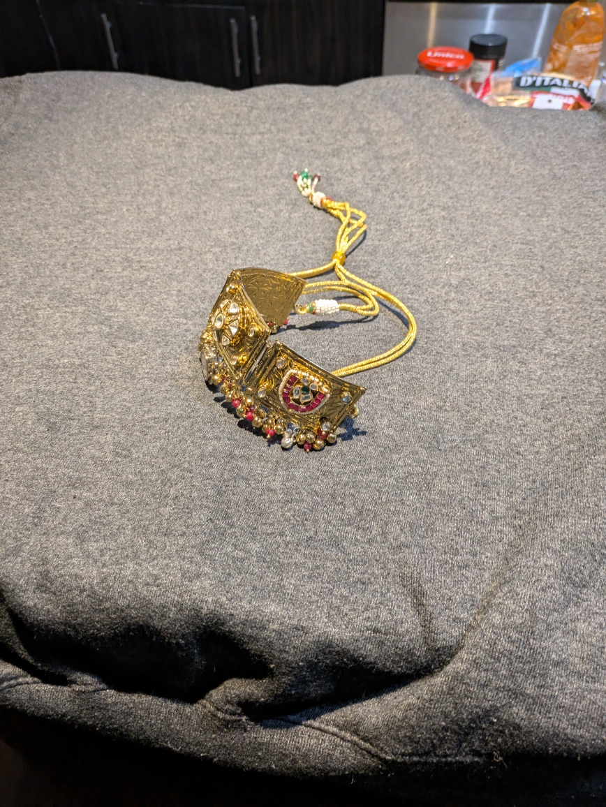 10Selling a unique gold-toned necklace with intricate detailing and colourful beads. It's in great condition and ready to add some sparkle to your outfit!