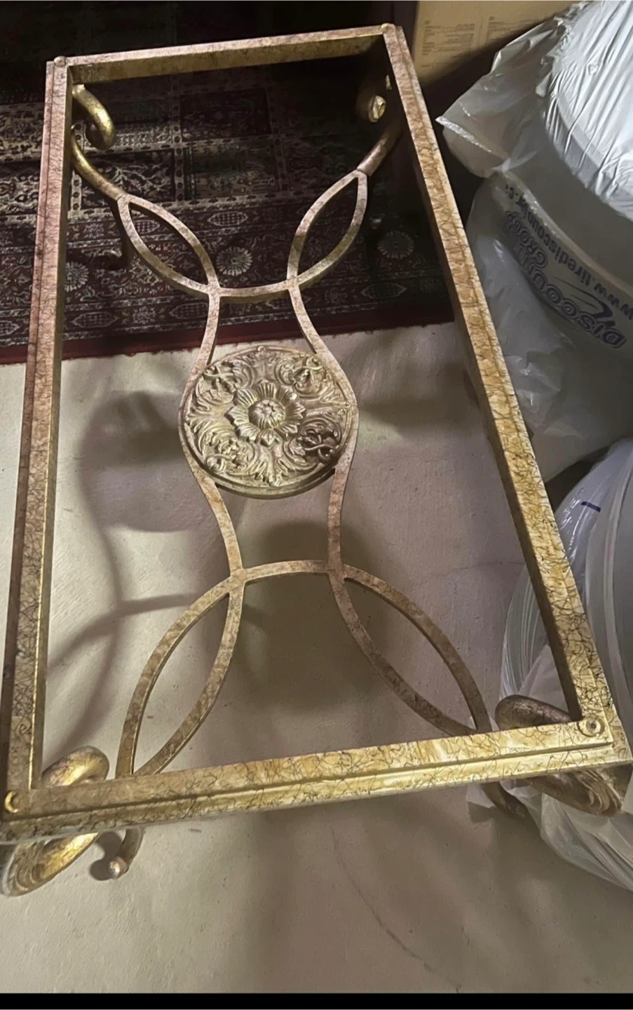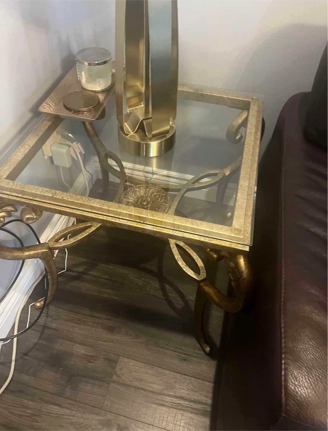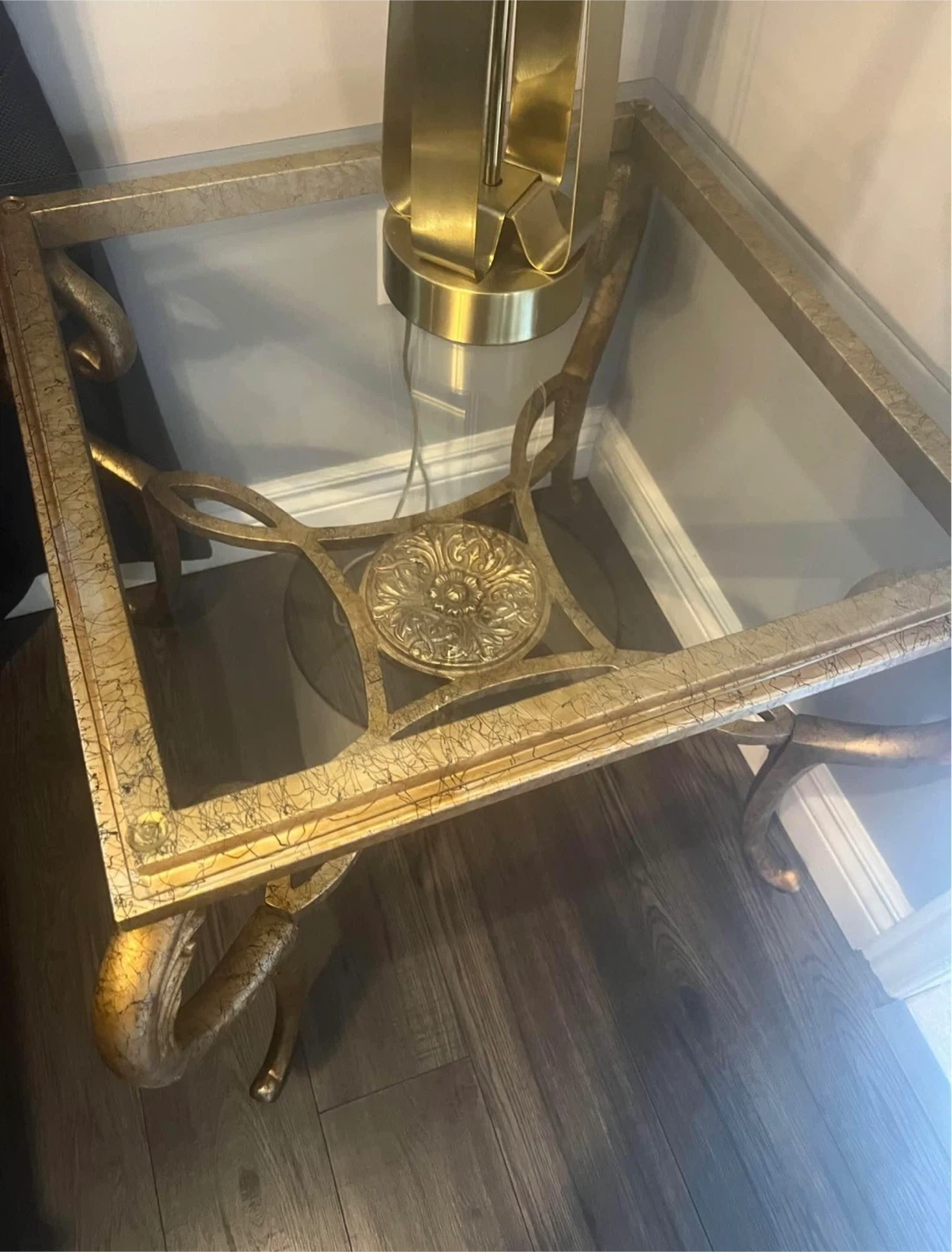 10Selling a beautiful gold-toned end table with a glass top! It has a unique and elegant design that would look lovely in any living room or bedroom. It's in great condition and ready for a new home. If you're interested, feel free to message me! Unique coffee table set. Gold and glass. The glass for the coffee table is broken.