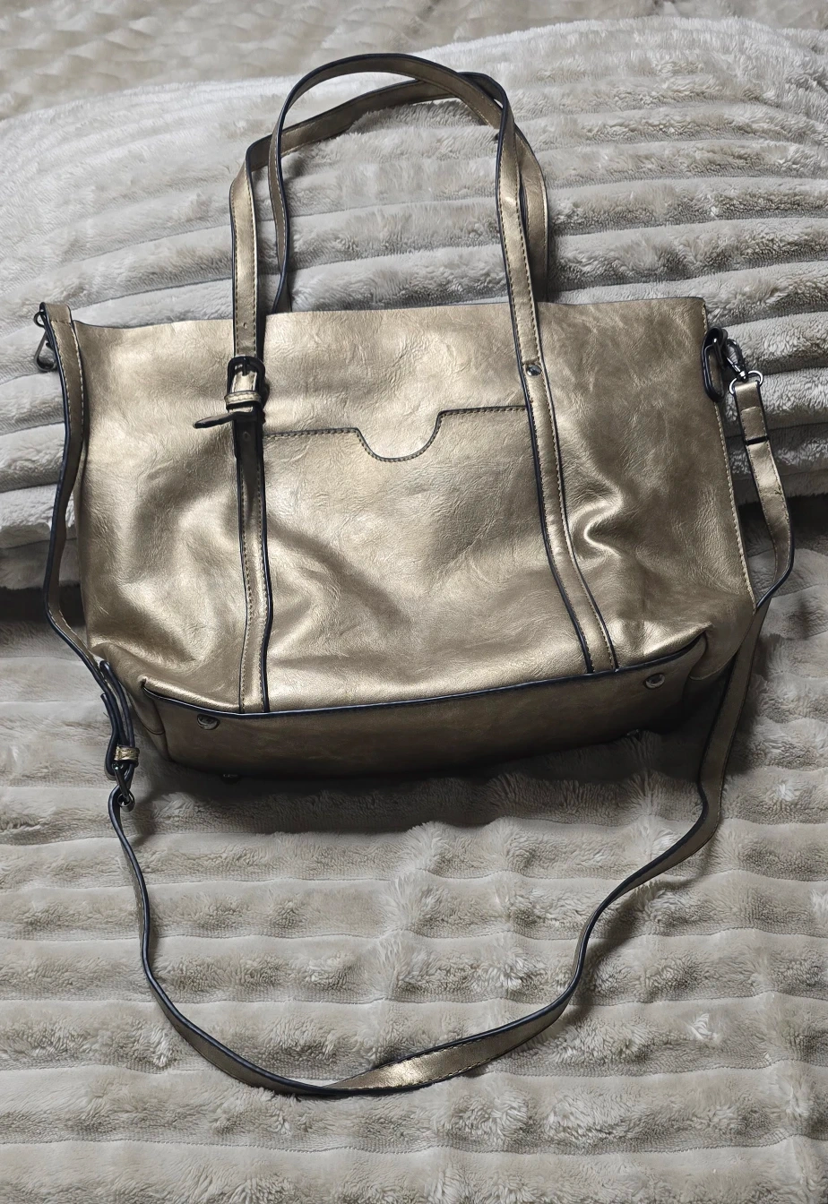 53Selling a stylish gold tote bag! It comes with both handles and a shoulder strap for versatile carrying options. Perfect for everyday use or a night out