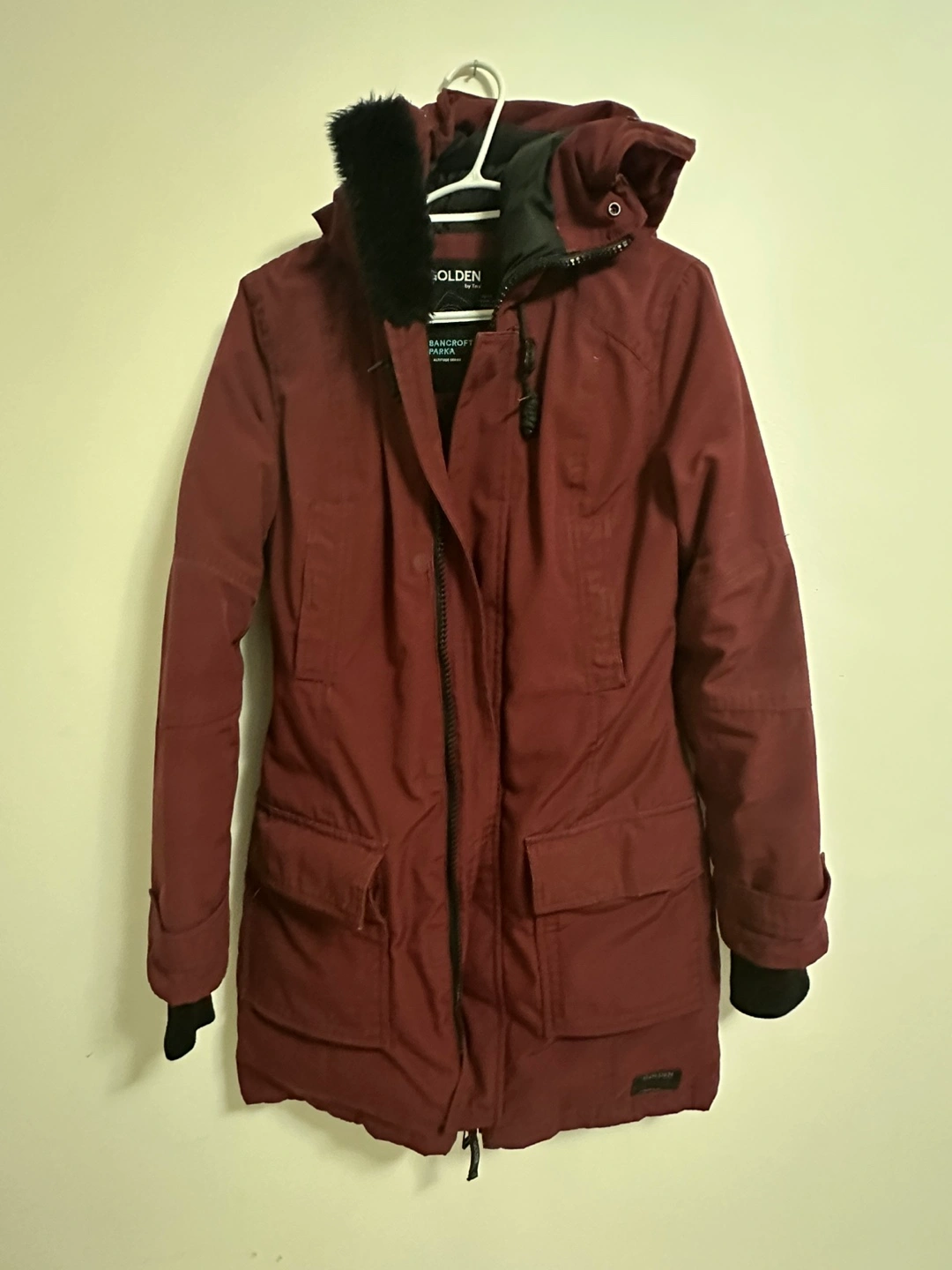 Burgundy parka with faux fur hood. Long sleeves with ribbed cuffs. Two large front pockets. Zipper closure. Very warm. Negotiable