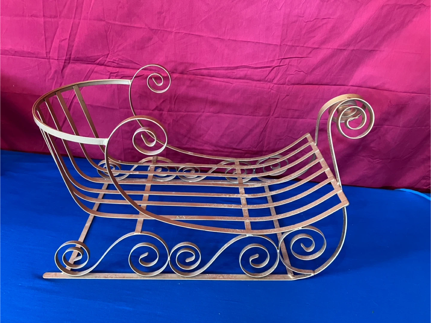 This is a metal sleigh in a gold colour. Perfect for holding Christmas decor, wood, magazines,etc. It’s approx 13 1/2” high x 26” long x 13 1/2” wide. It's in great condition and ready for a new home! Non Smoking, Pet friendly home. (Numbers are for seller’s purpose) Cross Posted, No try-ons or returns