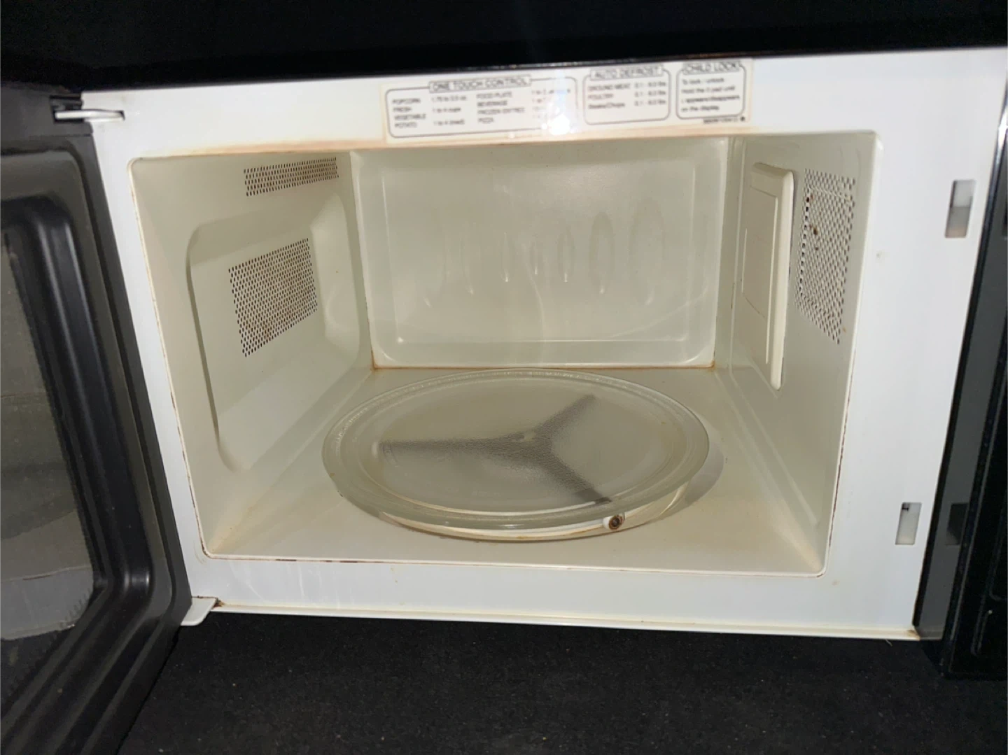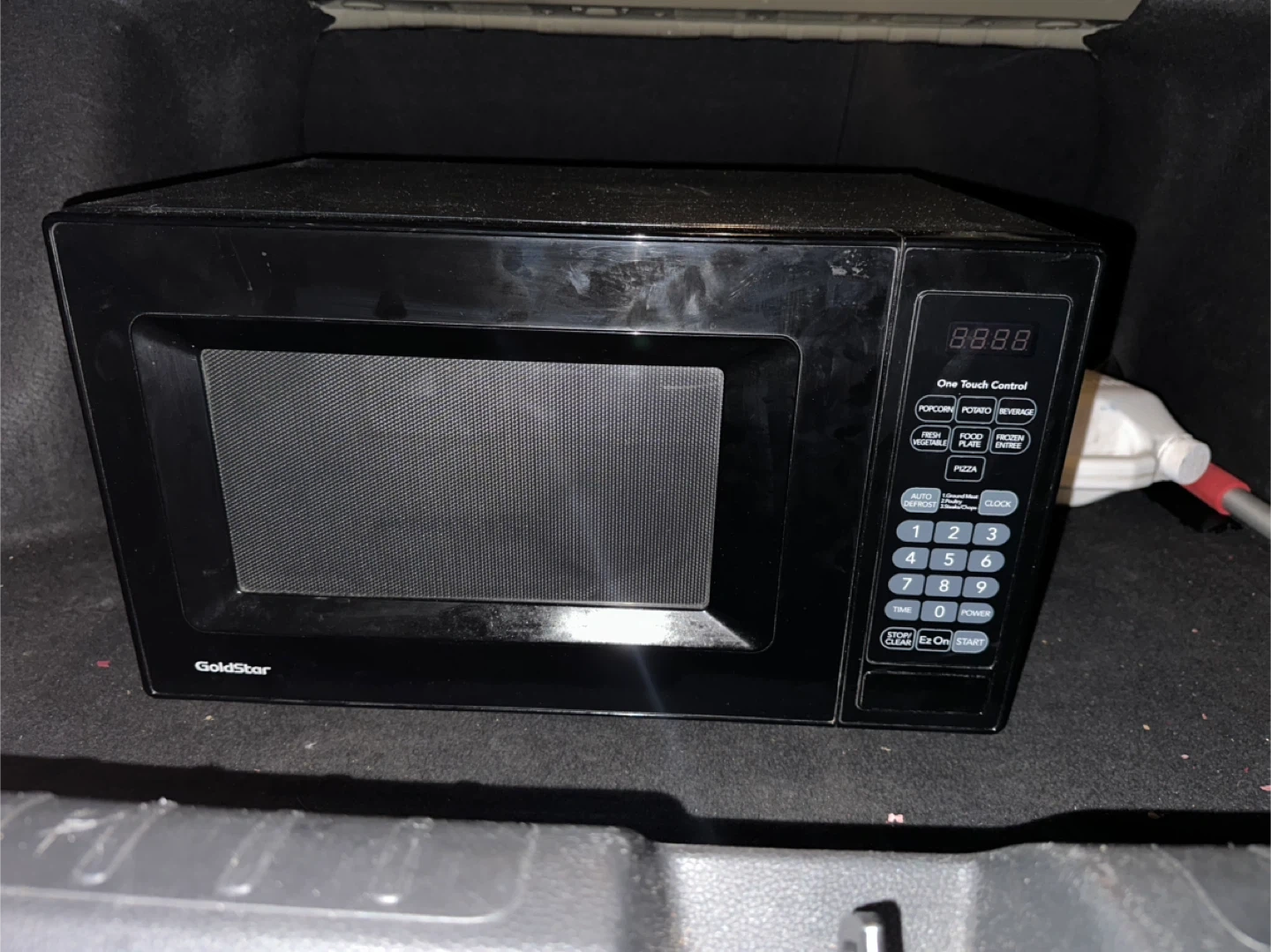 Selling a used Goldstar microwave in black. It has one-touch controls for popcorn, potato, beverage, fresh vegetable, food plate, frozen entree, and pizza. There are some signs of use.