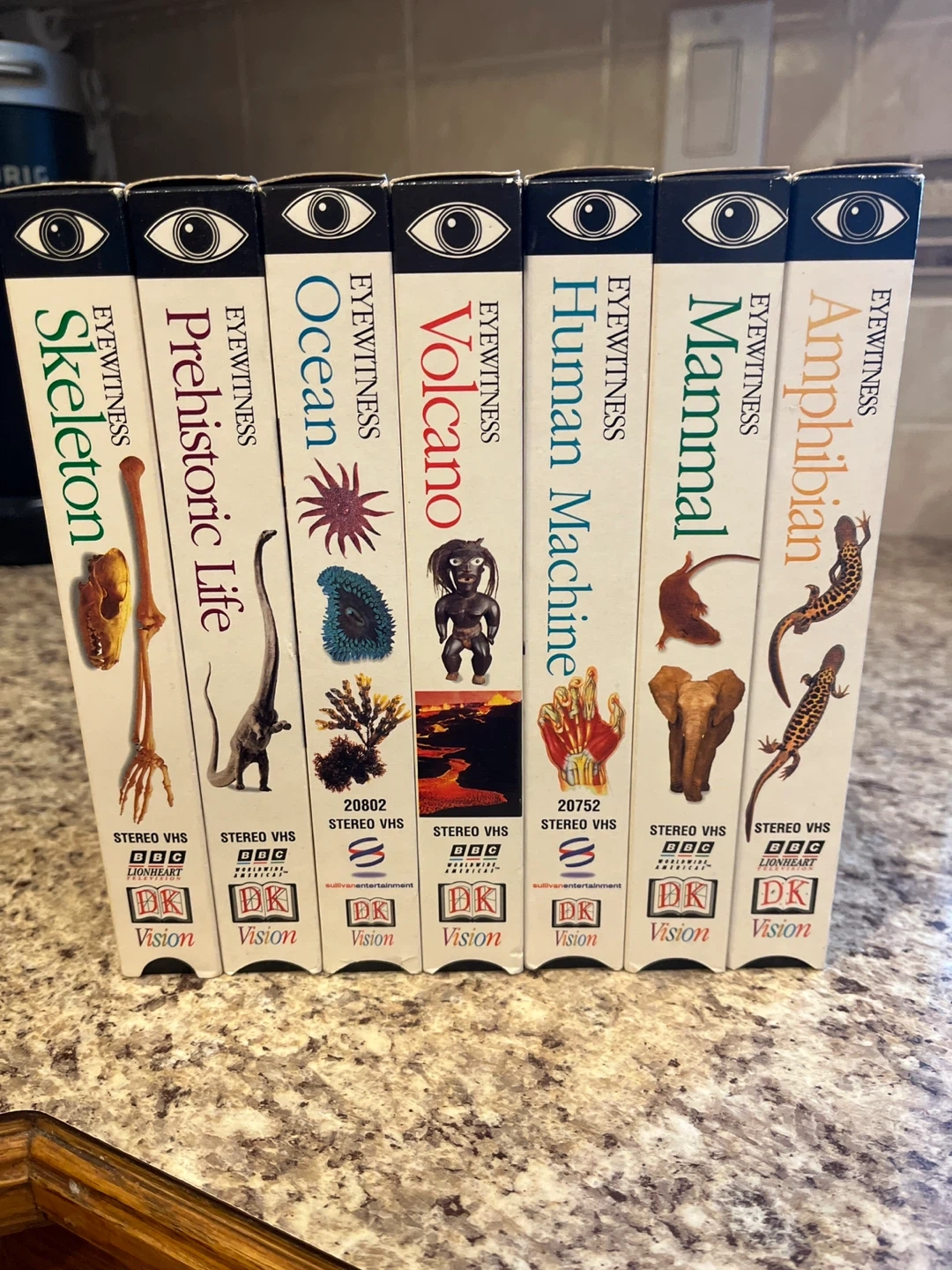 A collection! 7 Eyewitness VHS tapes. Titles include Skeleton, Prehistoric Life, Ocean, Volcano, Human Machine, Mammal, and Amphibian. These are Stereo VHS tapes from BBC Lionheart and DK Vision.
