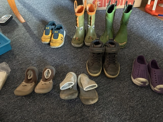 This is a used kids' shoe bundle featuring a variety of styles and brands. Included are Under Armour runners, Geox runners, and several pairs of soft house shoes. Perfect for toddlers and young children, these shoes are great for everyday wear. They have been previously enjoyed and show signs of wear but still have plenty of life left for your little one. These shoes are great for daycare.