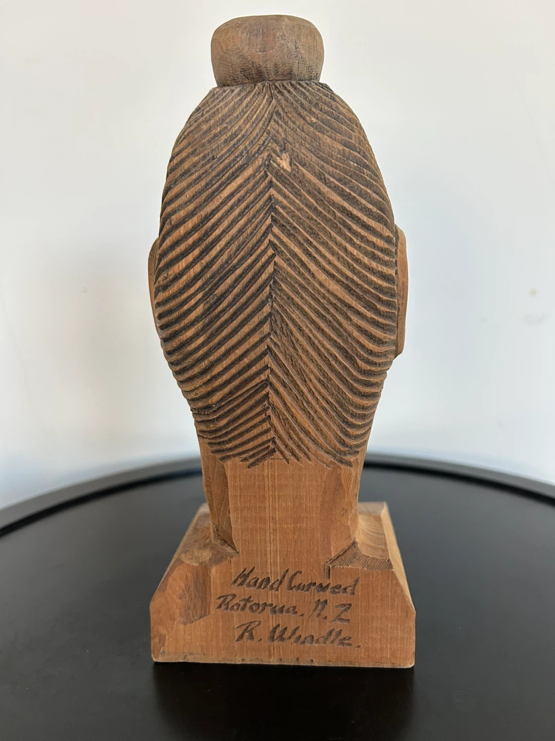 Beautifully detailed vintage Māori hand-carved wooden bust, signed “R. Windle” on the base and crafted in Rotorua, New Zealand – a world-renowned center of Māori carving and cultural artistry.