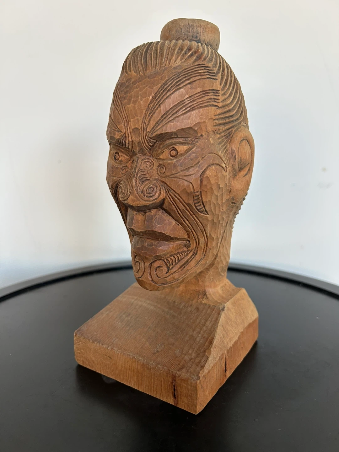 This expressive carving features intricate tā moko (traditional facial tattoo) patterns and a classic top-knot hairstyle, capturing the strength and mana of a Māori warrior figure. The facial detailing and flowing carved lines reflect the traditional whakairo (carving) style associated with the Rotorua region.