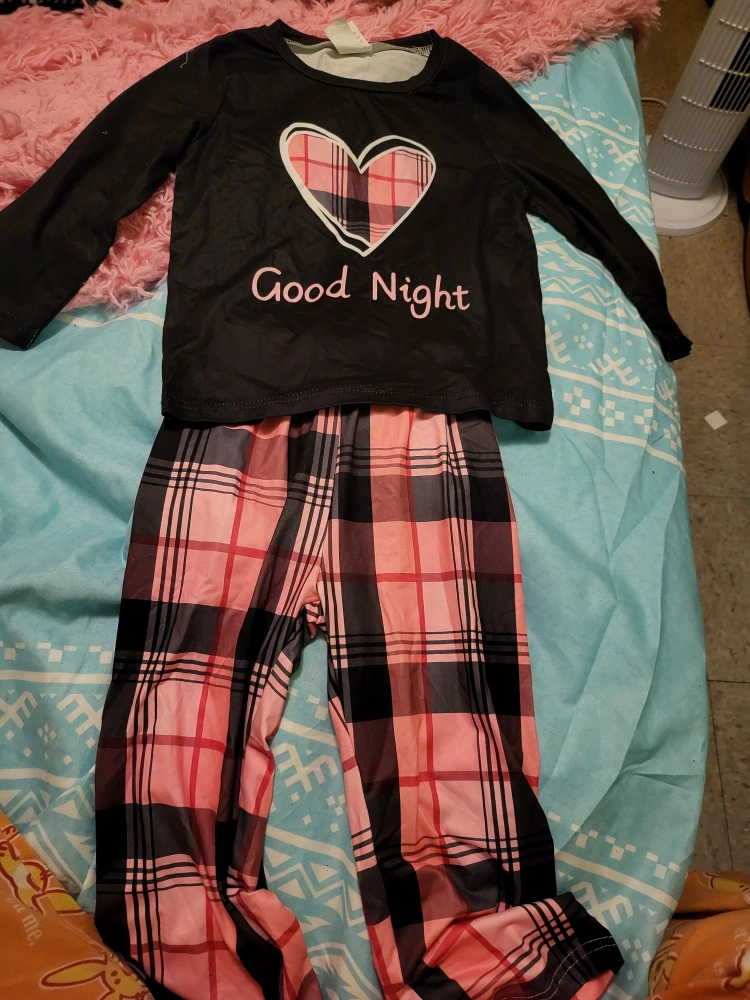 The set includes a long-sleeved top and matching plaid pants. Top with a cute heart design, and the words "Good Night". It's just the thing to help you get a great night's sleep.