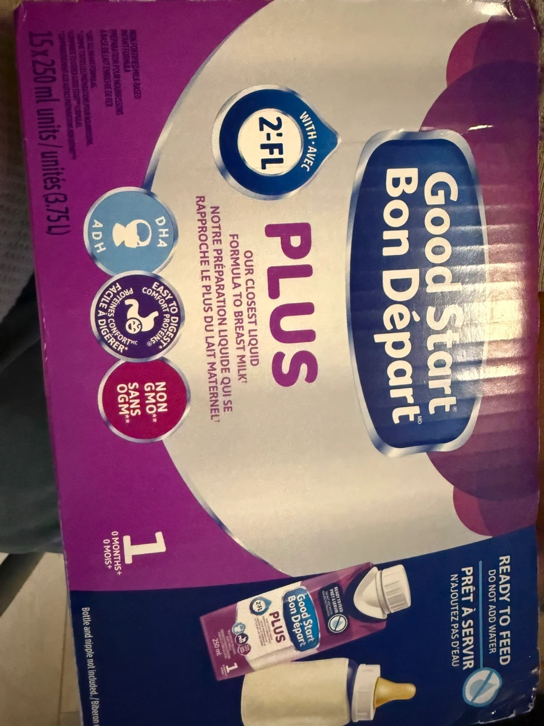 75Selling a box of Good Start Bon Départ PLUS liquid formula. It's our closest liquid formula to breast milk and is easy to digest. It's also non-GMO Pack of 15 * 250 ml pack Only used 1 Bought it for $60