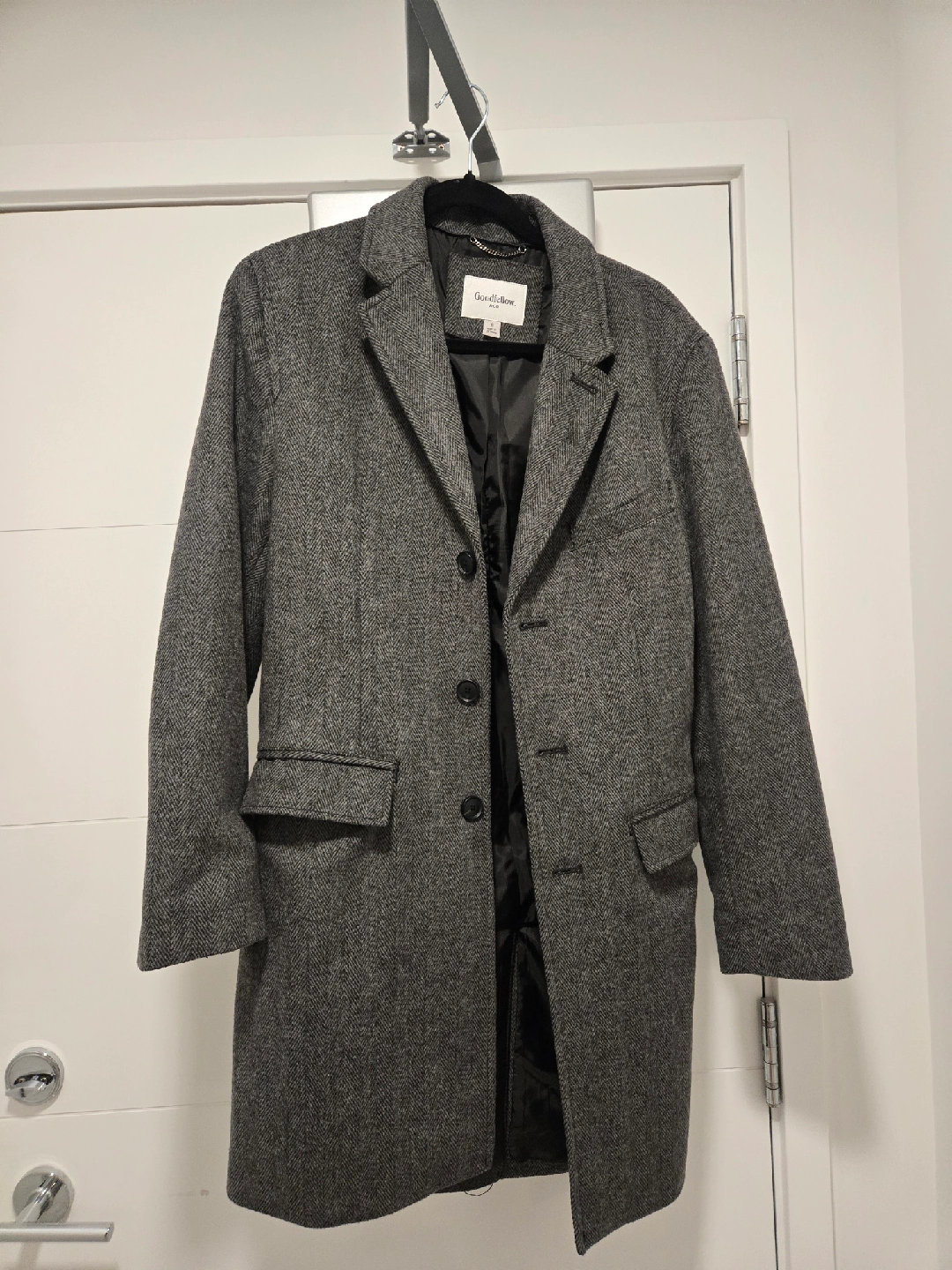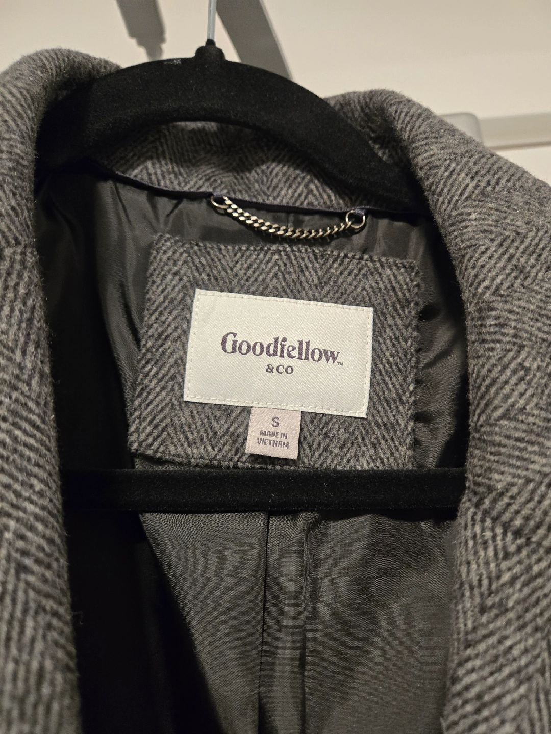 Selling a stylish Goodfellow & Co. herringbone coat in size small. It's a classic piece that's perfect for layering! The coat features a timeless design and is made from a durable material. Great for adding a touch of sophistication to any outfit