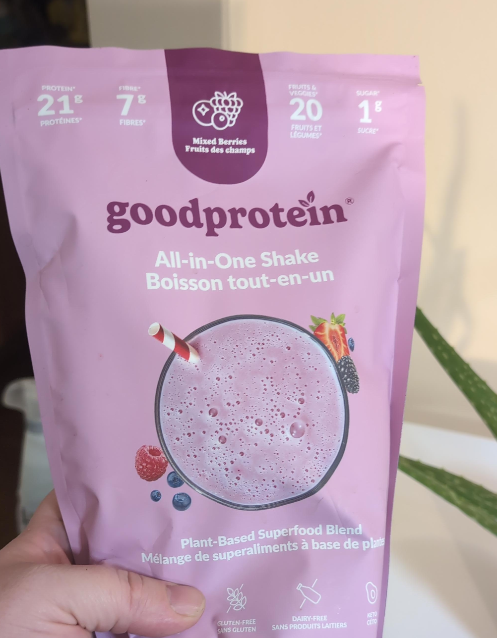 Selling a bag of Goodprotein All-in-One Shake in Mixed Berries flavour! It's a plant-based superfood blend that's both gluten-free and dairy-free. Perfect for a quick and easy protein boost