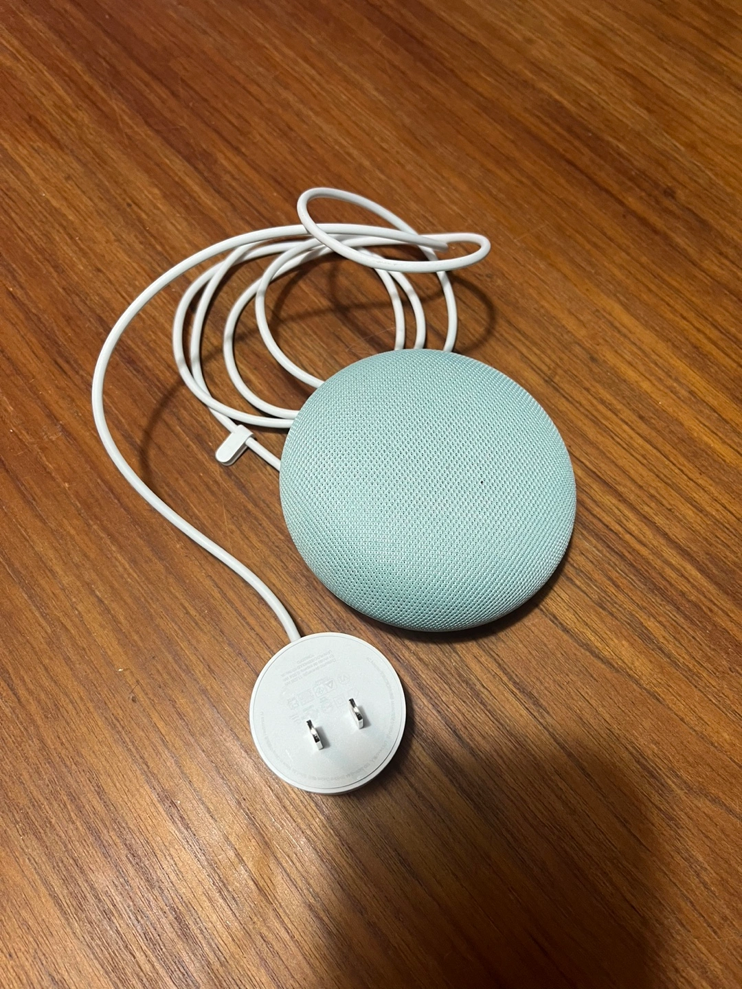 Google Home Mini smart speaker. Comes with power adapter and cord.