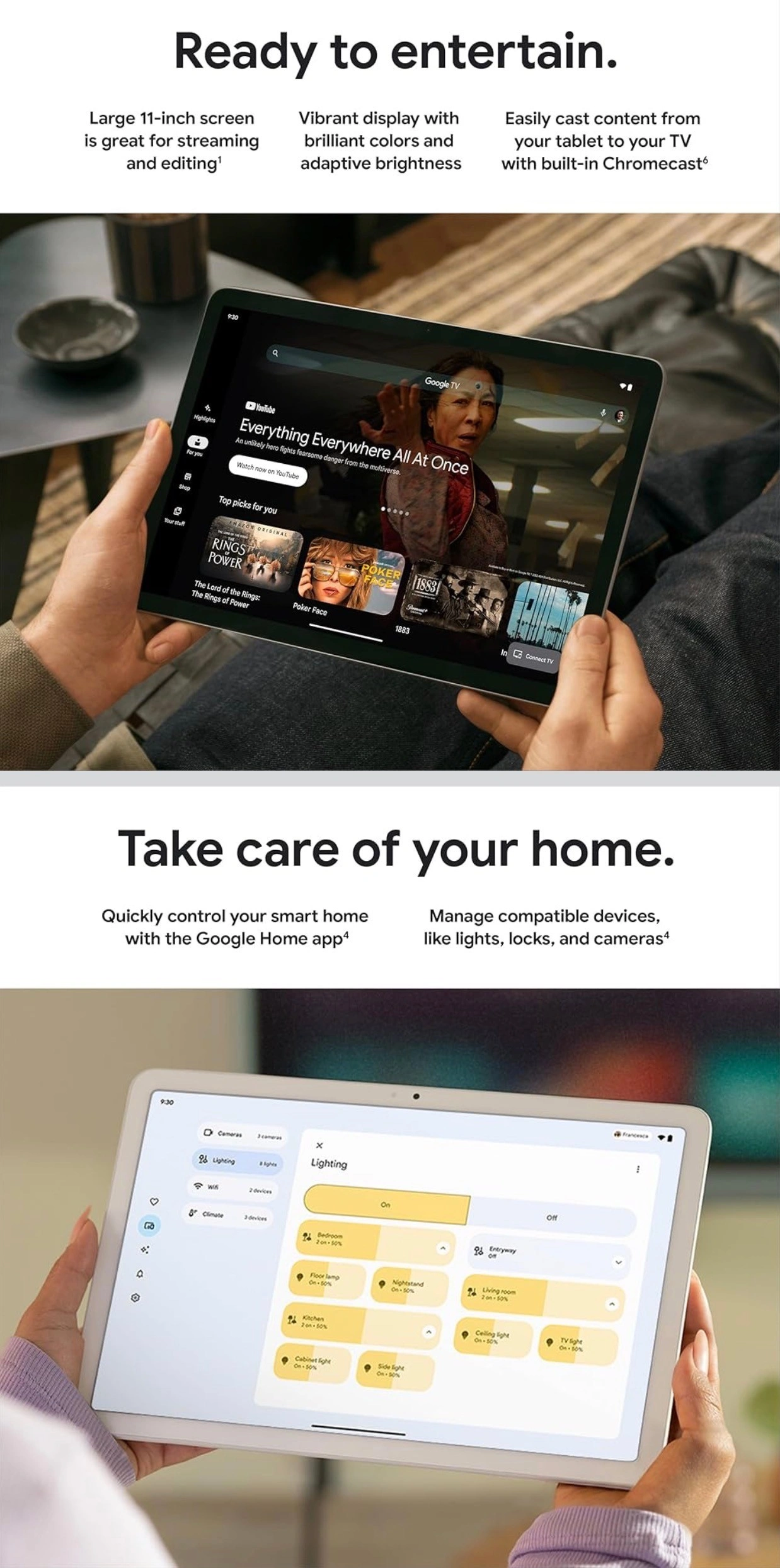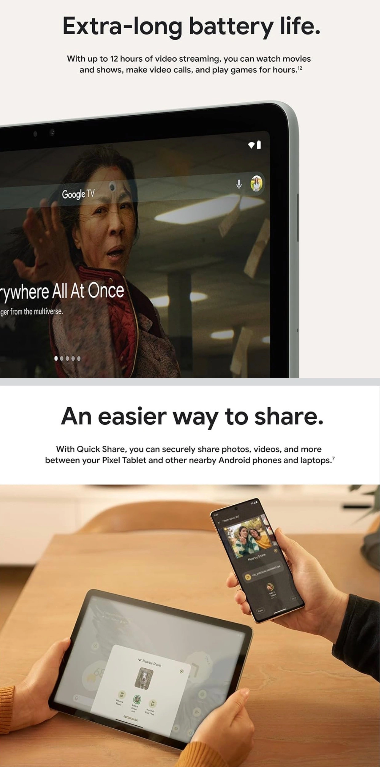 Google Pixel Tablet 11-Inch Screen 7020 mAh 27Wh Extra-Long Battery Life 128GB UFS 3.1 fast storage USB-C 3.2 Porcelain color NOTE: New open-box but never used (I opened the seal for assurance) The Pixel Tablet is helpful at home and with work; it features Google AI for smooth streaming, high-quality video calls, and more The 11-inch screen with brilliant colors and adaptive brightness is perfect for streaming shows and movies and editing photos and videos[1]; and multitasking is easy with Split Screen[10] Google AI helps with everyday tasks; search anything right from the app you’re in, just by drawing a circle around an image, text, or video[15]; and Magic Editor makes photo editing easy; AI can change the background, move objects, and more[16] Kickstart your productivity and creativity with Gemini; brainstorm ideas, write notes, make plans, and more[2,17] Manage your smart home devices with your voice or a tap on the home panel; access and adjust your compatible thermostats, lights, locks, and cameras[4] The Android apps you love are optimized for your Pixel Tablet’s larger screen; watch shows and movies with Google TV[5] and cast content with Chromecast built in[6]; a Charging Speaker Dock (sold separately) is required to initiate casting Securely share photos, videos, and more between your Pixel Tablet and other nearby phones and laptops with Quick Share[7]