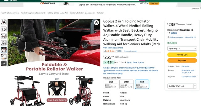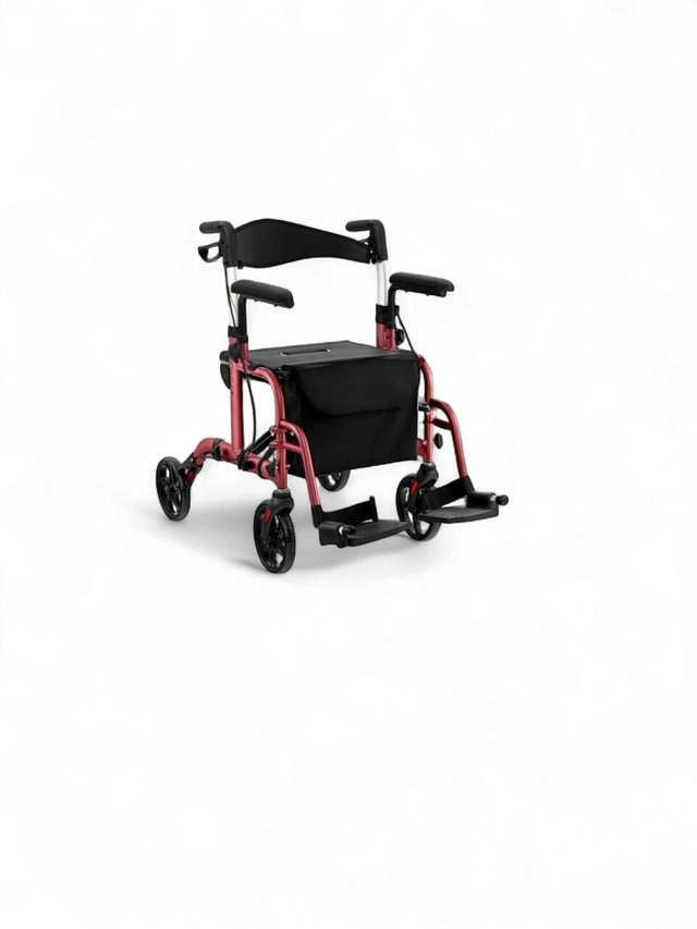 65This 2-in-1 rollator walker is a necessary addition to disabled people and seniors. Specially designed reversible backrest and rotatable footrests can be flipped over to meet users’ needs of walking and sitting. High quality aluminum alloy and sturdy structure ensure high stability, durability and heavy load capacity of 300lbs. This lightweight rollator with folding design can be carried effortlessly. And the handle with 6 adjustable heights can be easily set a humanized height by pressing the button. Also, handbrakes allow users to pull up to control speed and push down to park the walker as needed. Extra removable storage bag and sided umbrella/cane holder facilitate items carrying. All in all, our rollator helps users hang out freely and effortlessly. Features: 2-in-1 rollator can be used as a walking aid and a wheelchair as you like 6 adjustable heights fit users of various heights for better use experience Dual hand brakes can achieve controling speed & parking as needed Folding footrests with a buckle can save space when not in use Aluminum alloy structure for high stability & durability X-shaped frame can load up to 300lbs and ensure its safety Storage bag & umbrella/cane holder make hanging out more effortless 8” wheels suitable for multiple terrains and rolling smoothly indoors and outdoors One-hand folding design for easy carrying & storage Soft padded armrest for being a comfortable place to put hands Brand New goes for $150 to $200