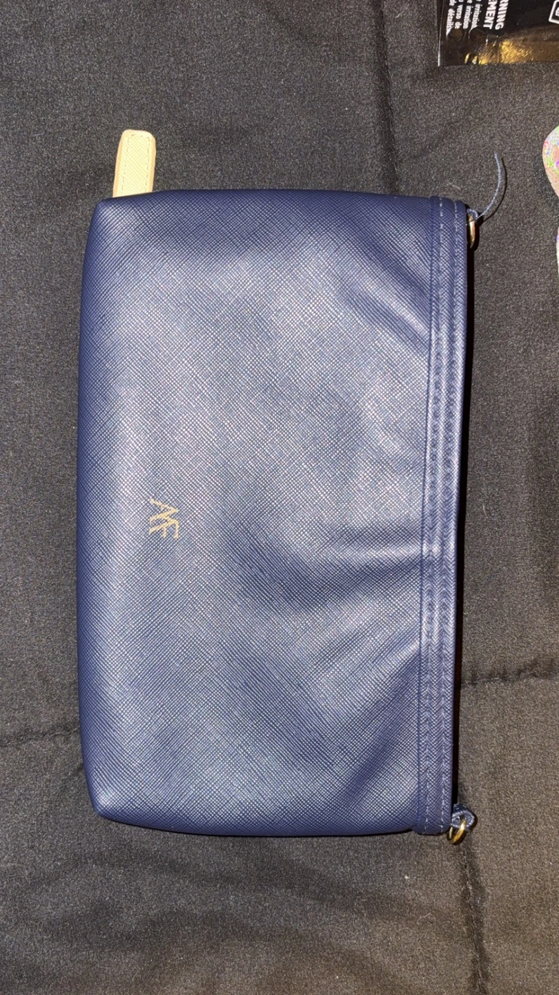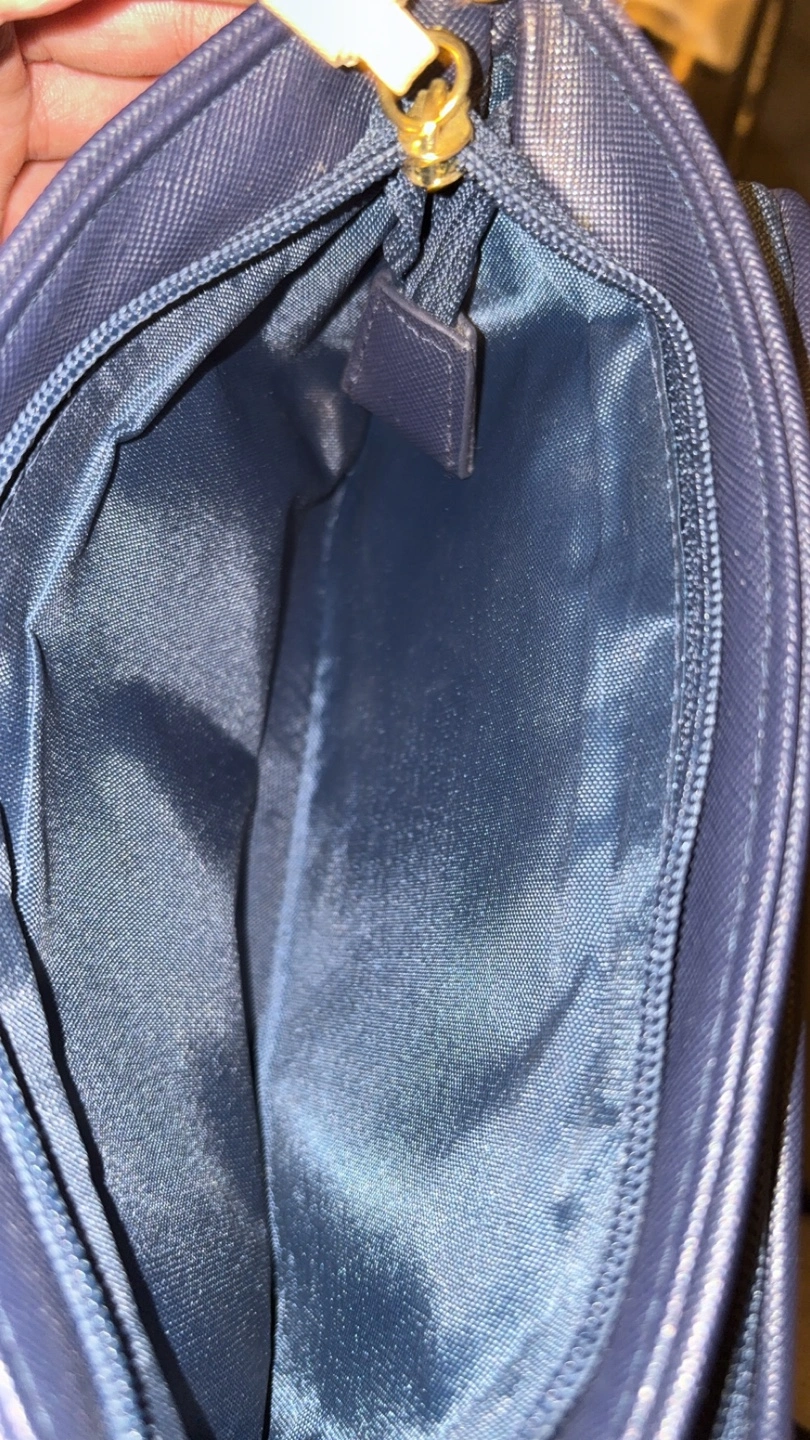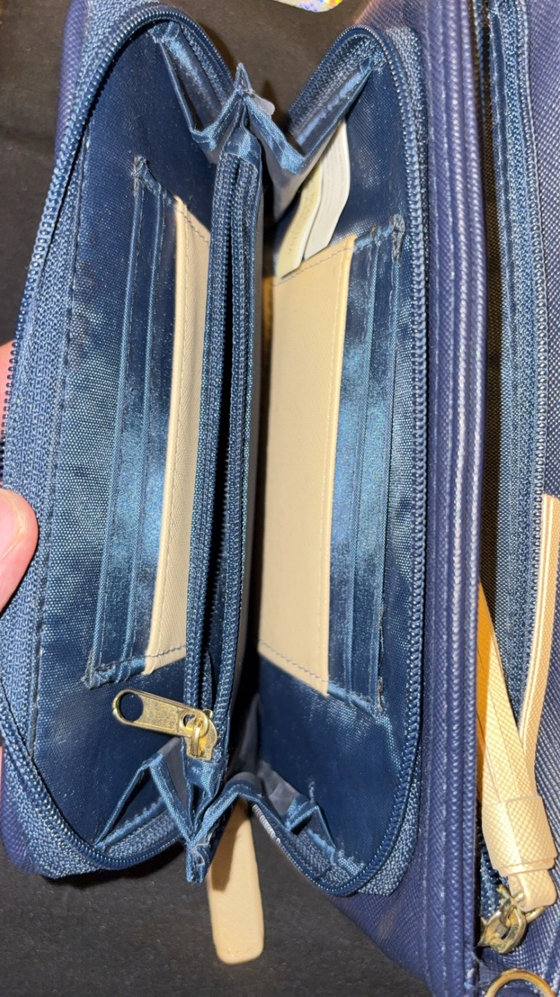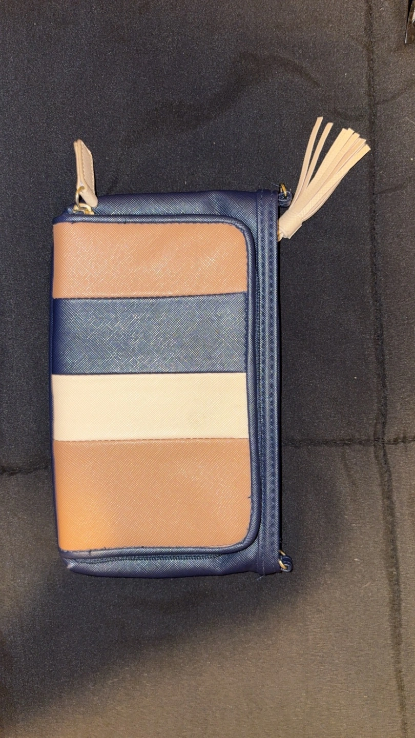 Stylish crossbody bag. Features a navy blue, beige, and white striped design. Multiple compartments and zipper closures. Cream-coloured tassel detail. Perfect for everyday use.