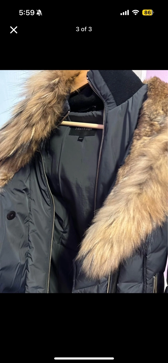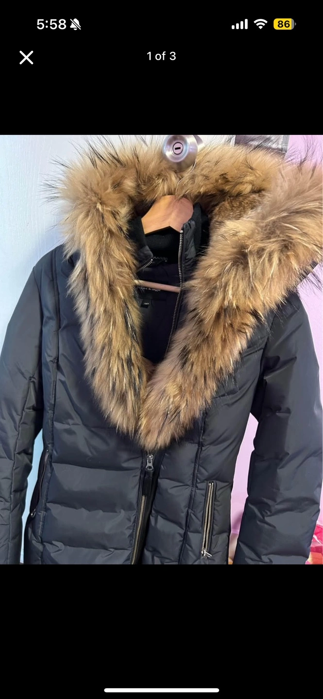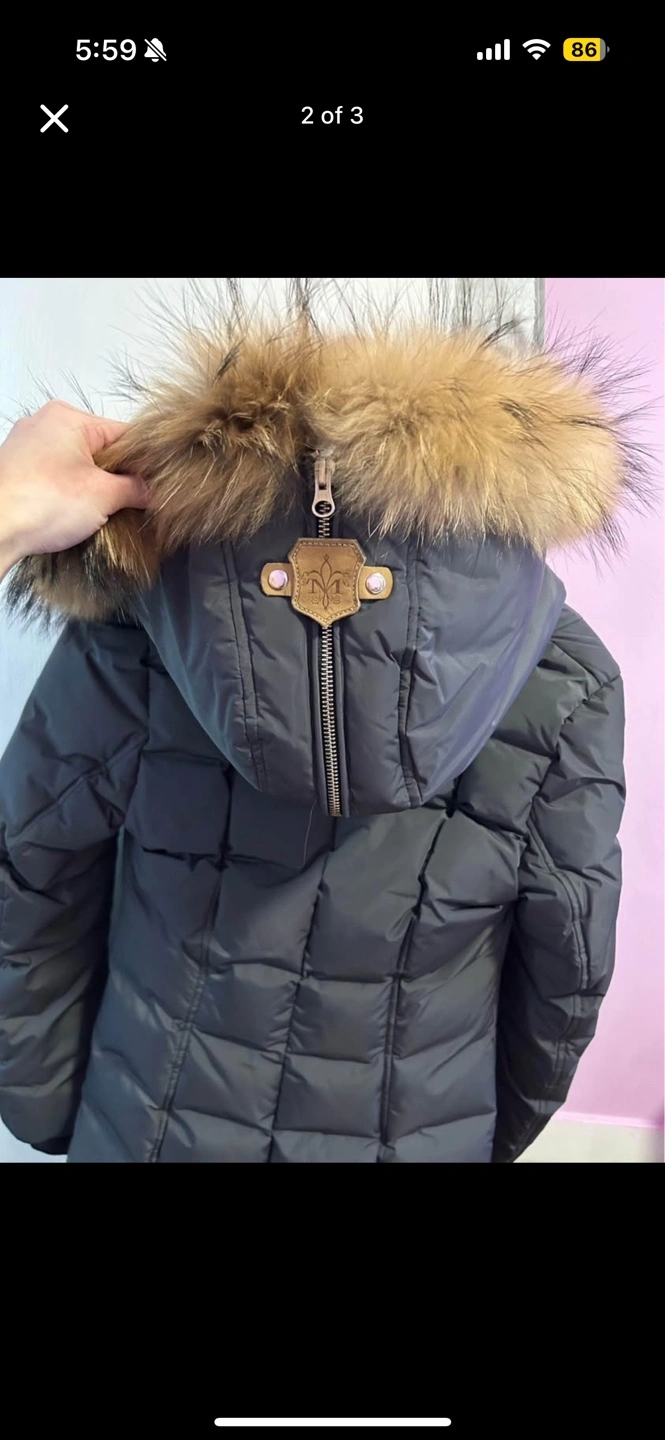 Stunning dark grey down-filled jacket. Features a large, luxurious fur-trimmed hood. Zipper and snap closure. Pockets. Excellent winter wear.