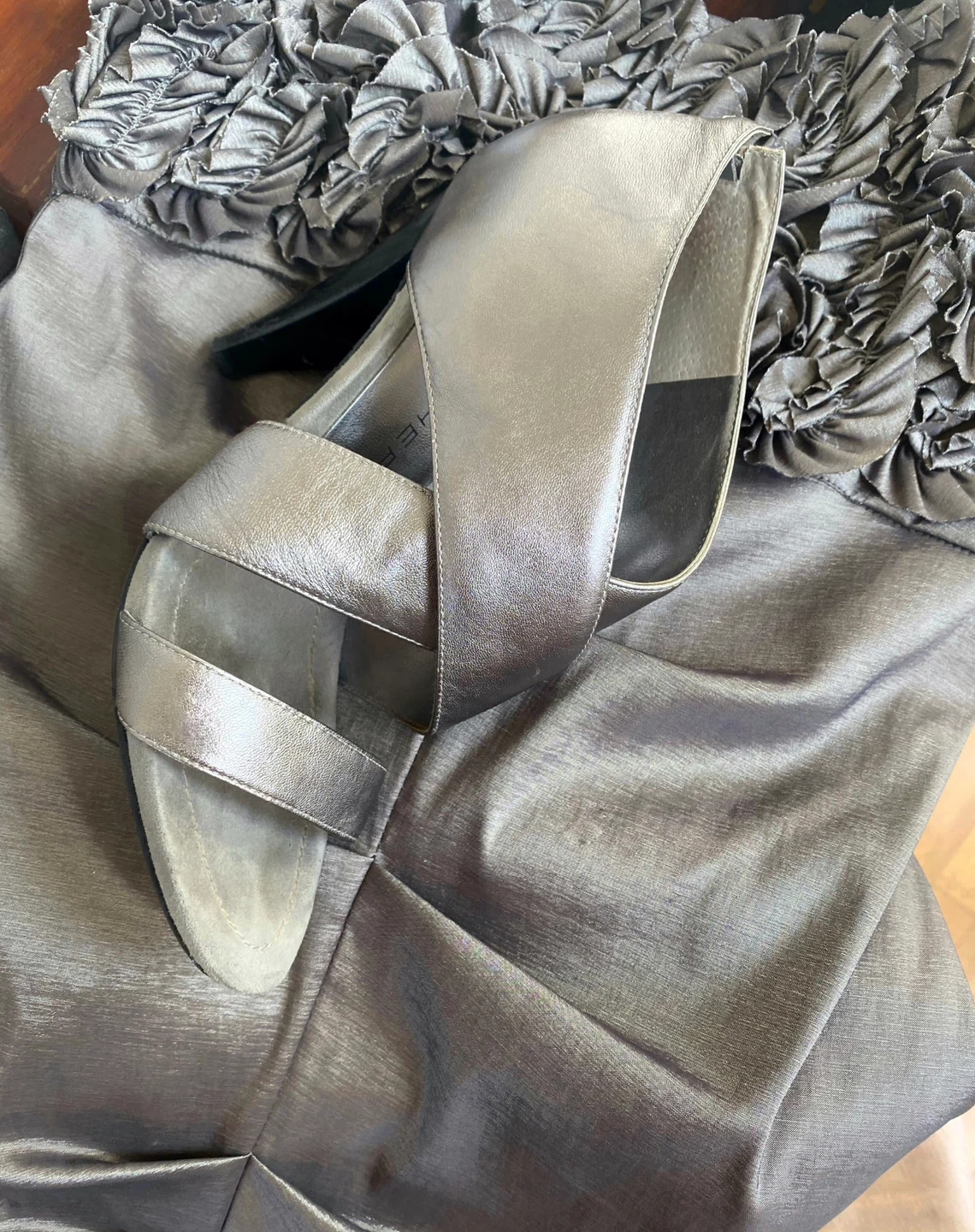 68⭐️Gorgeous pewter dress (6-8)&matching leather Marc Fisher shoes (7 1/2) ⭐️Dress is tagged as a SIZE 8 but it is definitely a smaller fit and would work for a SIZE 4-6 as well It has a bit of stretch as well which is nice⭐️ ⭐️I’m selling this together because the shoes actually 100% match this gorgeous dress and it so it’s a lovely set together. ⭐️The shoes are leather and by Marc Fisher and they are size 7 1/2⭐️ ⭐️This complete outfit is in excellent new condition as it was only worn once to an afternoon show for a few hours. ⭐️ would look great in spring summer,fall,or winter ⭐️ Price is already reduced and FIRM for the set (DRESS AND SHOES) $279 South Oak Bay pick up