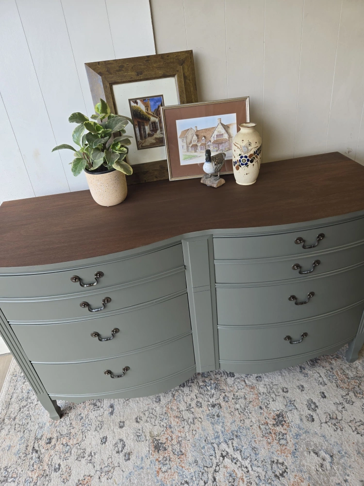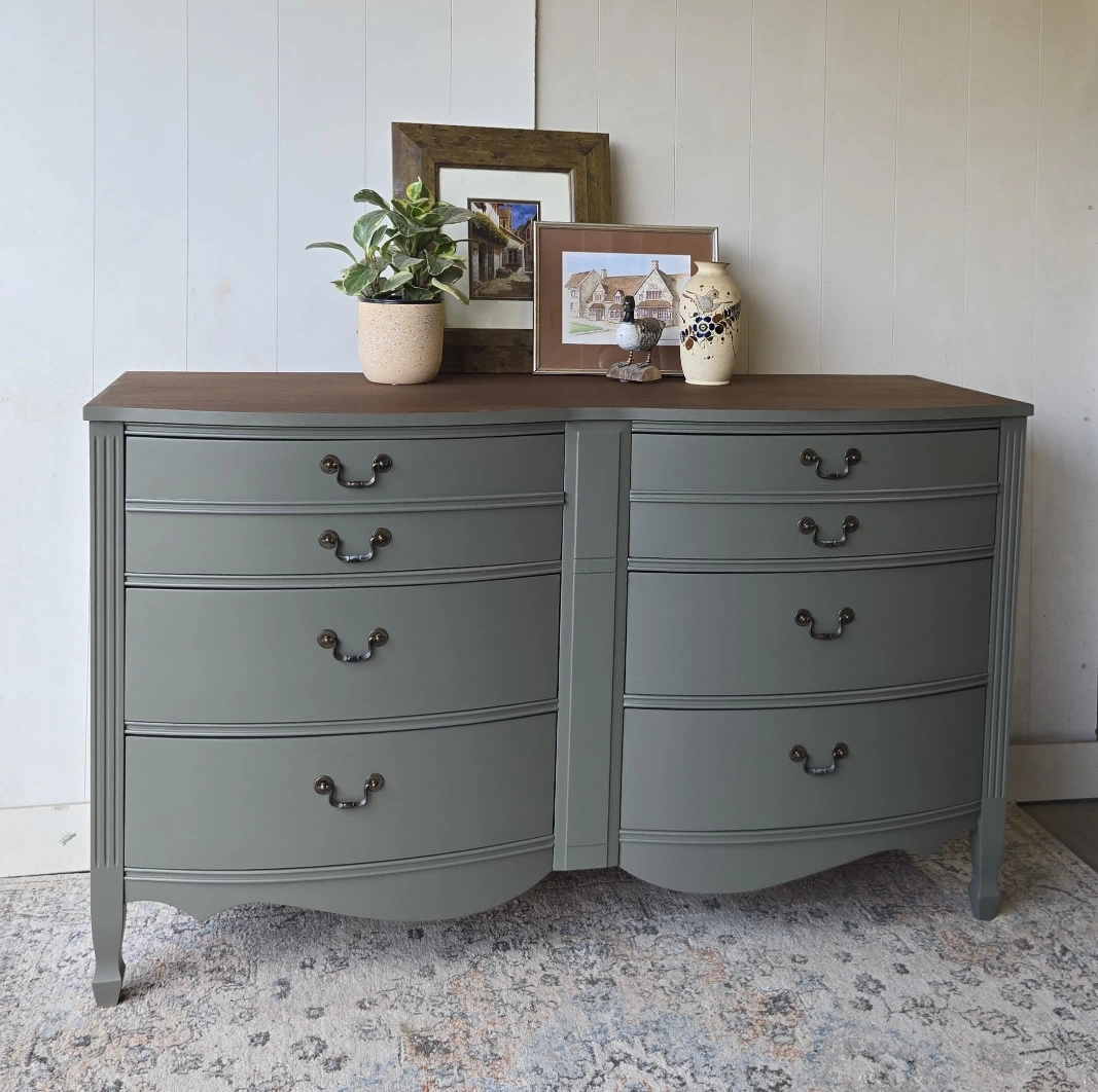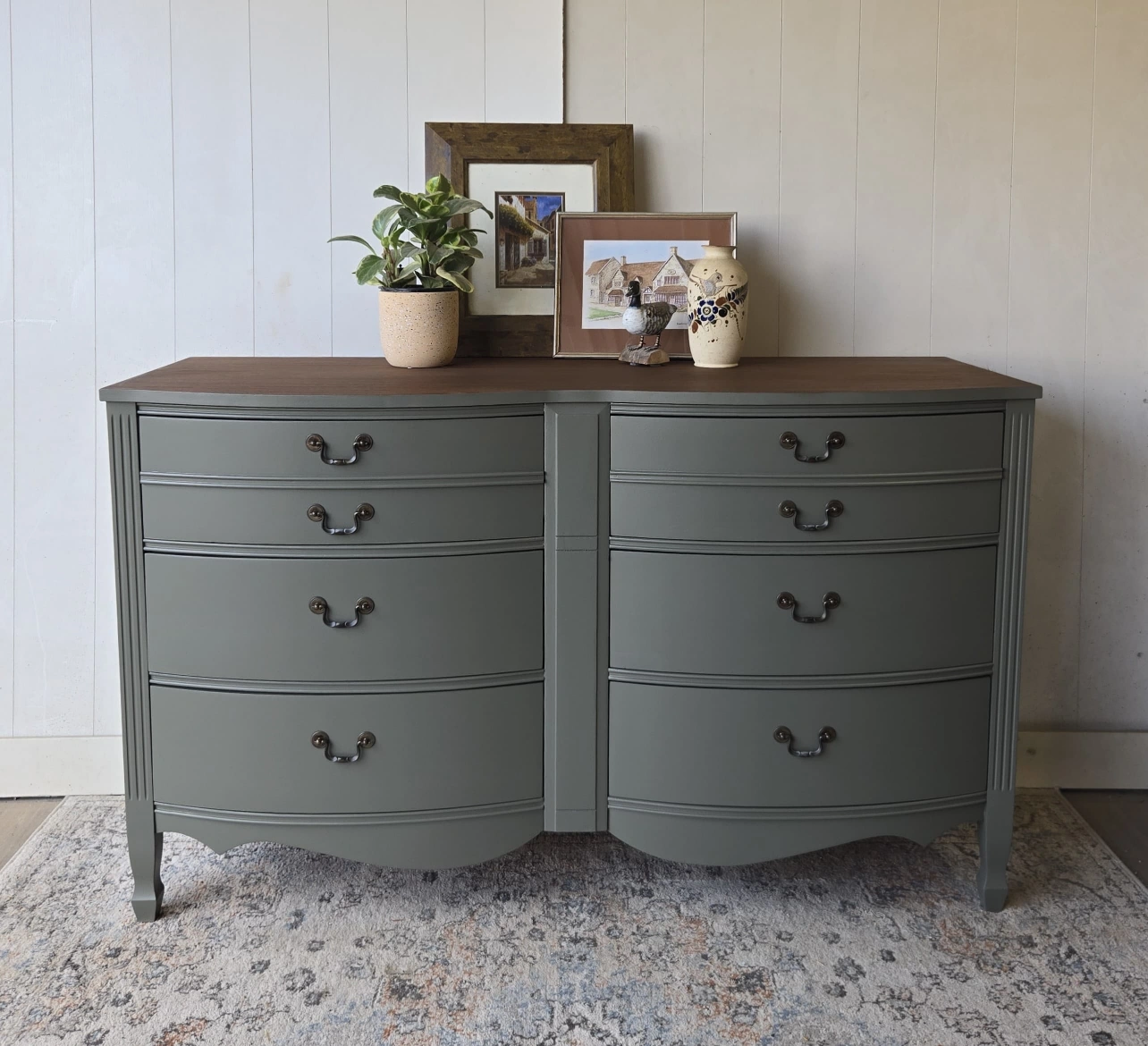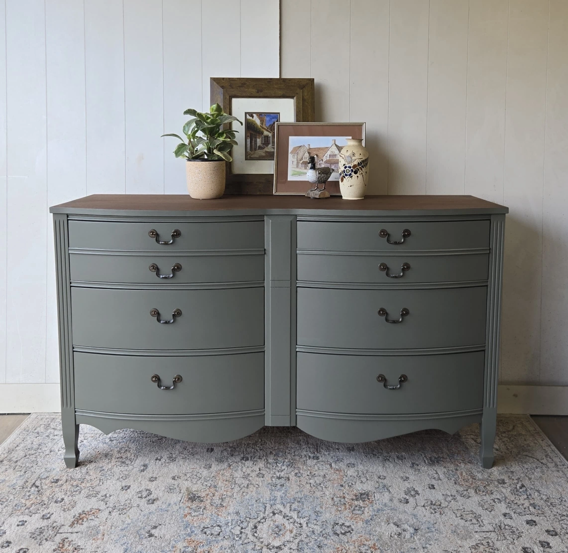 65🌟This absolutely stunning 6 drawer dresser is painted with Castle Peak Grey by Benjamin Moore. The top had been sanded down and stained with Antique Walnut by General Finishes. Top coated with Minwax clear coat for added durability.🌟 📏Dimensions 56" Length 20" Depth (curved area) 18" Depth (middle and ends) 34" Height 🌟If you would like to come a view this piece, let me know and we can set up a time!🌟 • First come, first serve • These pieces sell fast! • If you would like to hold this piece, a deposit is required 🛻 Delivery available within Calgary for a fee! Pick up in Cougar Ridge, Calgary 🎨Touch-up paint provided 📸 Photos / videos are unedited Follow our Instagram for more refinished pieces! Inquire if you would like a custom piece! @refinishedstudio