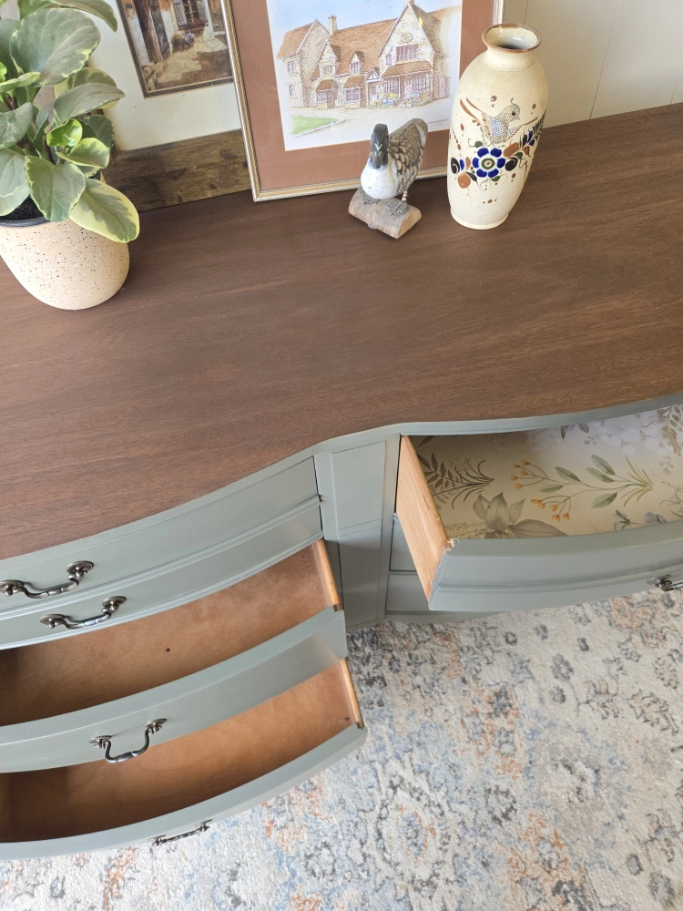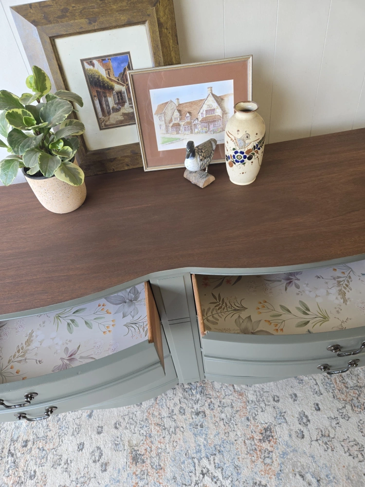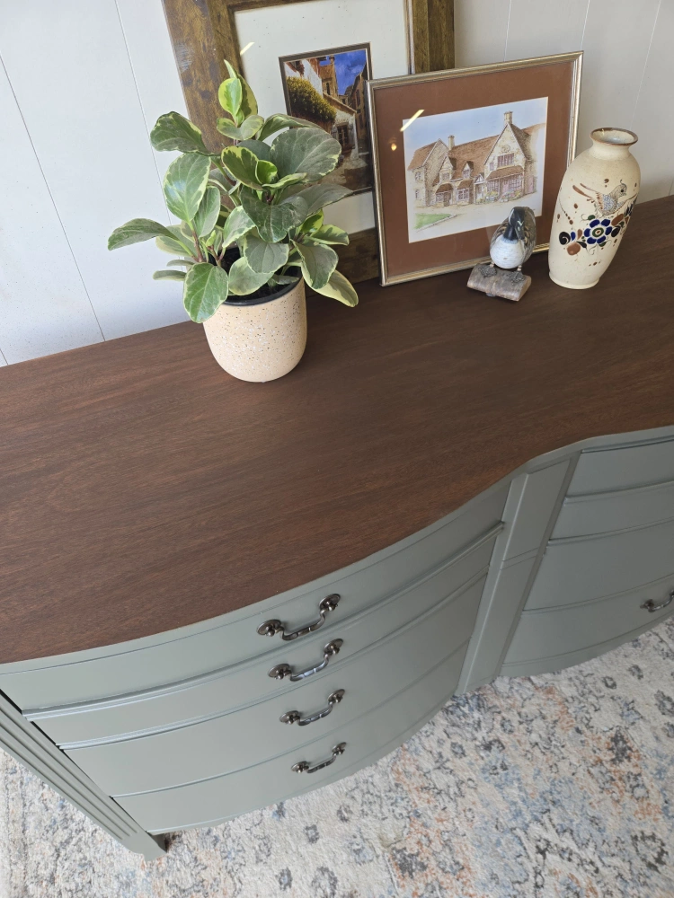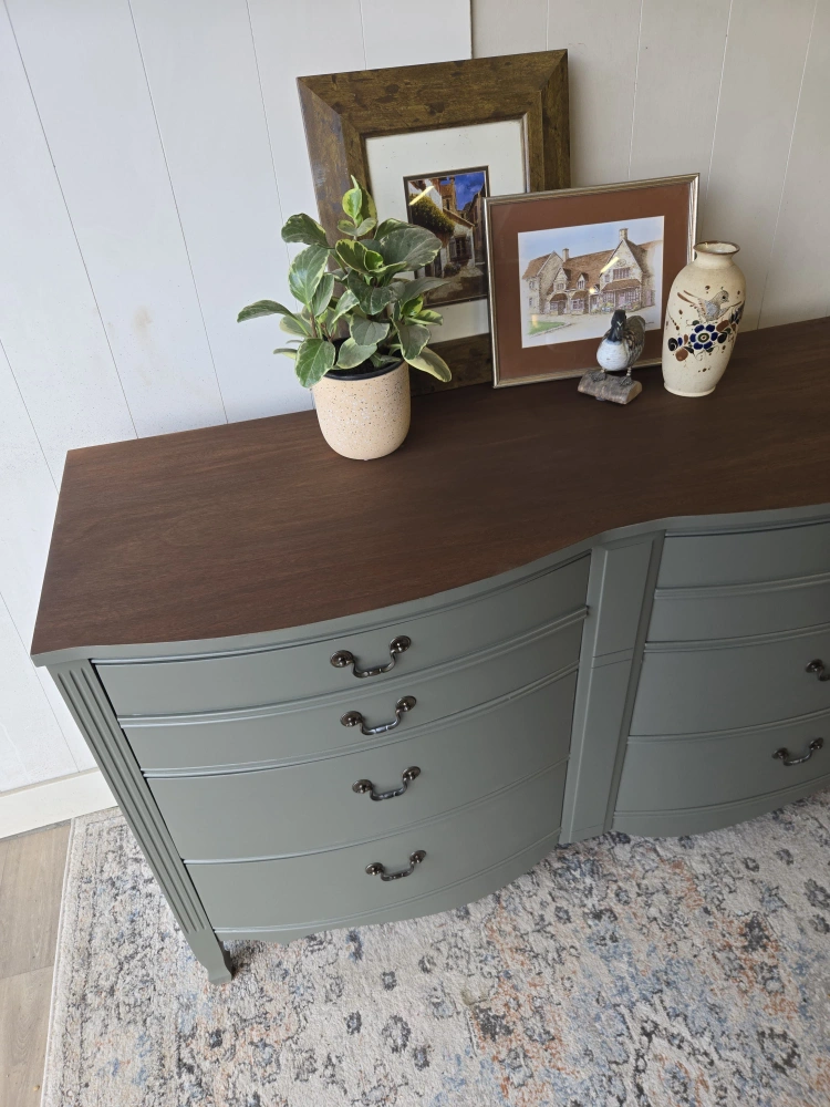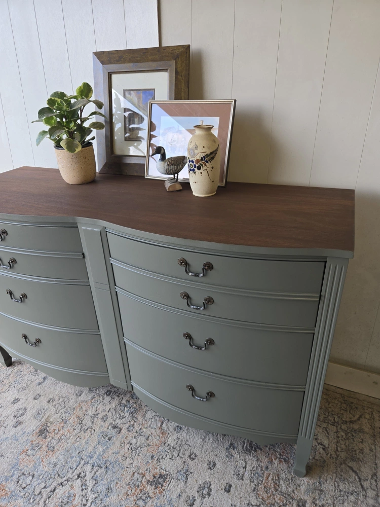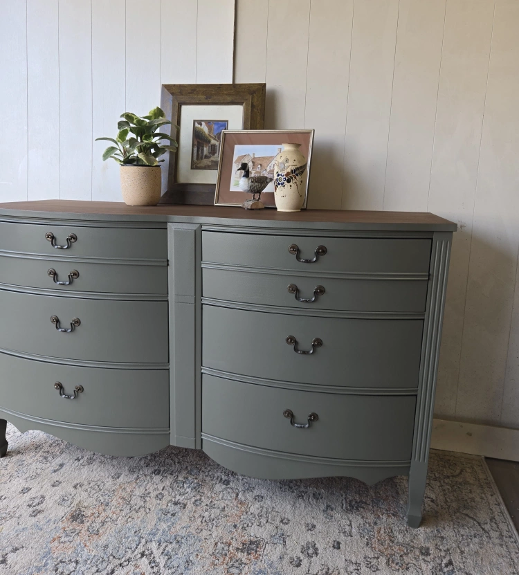 65🌟This absolutely stunning 6 drawer dresser is painted with Castle Peak Grey by Benjamin Moore. The top had been sanded down and stained with Antique Walnut by General Finishes. Top coated with Minwax clear coat for added durability.🌟 📏Dimensions 56" Length 20" Depth (curved area) 18" Depth (middle and ends) 34" Height 🌟If you would like to come a view this piece, let me know and we can set up a time!🌟 • First come, first serve • These pieces sell fast! • If you would like to hold this piece, a deposit is required 🛻 Delivery available within Calgary for a fee! Pick up in Cougar Ridge, Calgary 🎨Touch-up paint provided 📸 Photos / videos are unedited Follow our Instagram for more refinished pieces! Inquire if you would like a custom piece! @refinishedstudio