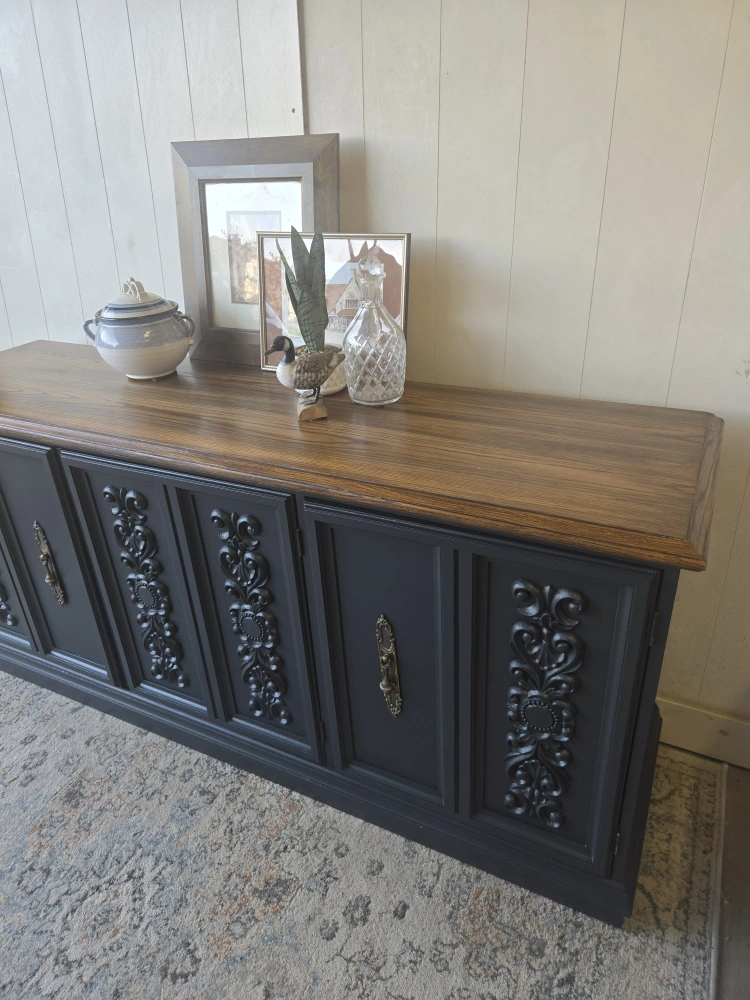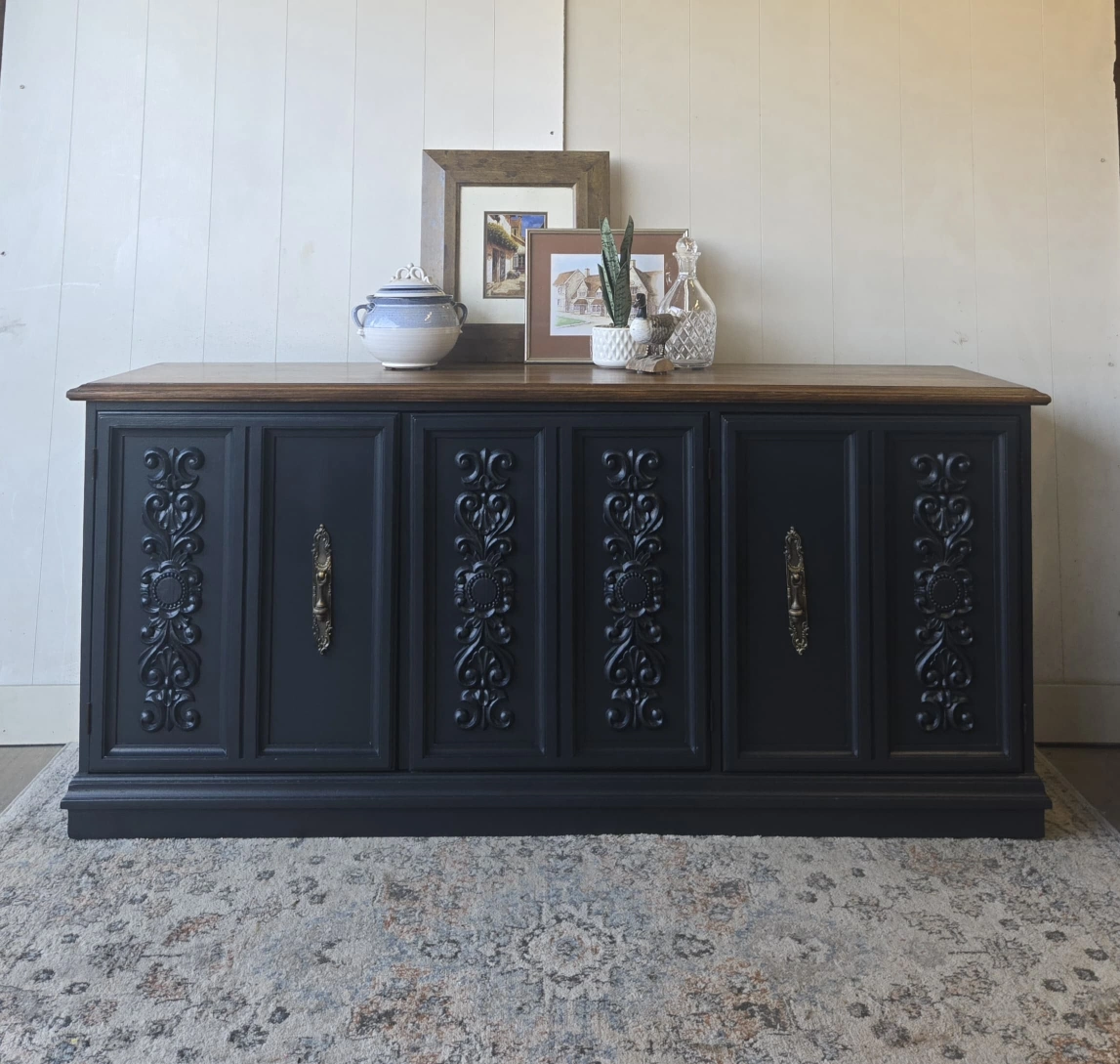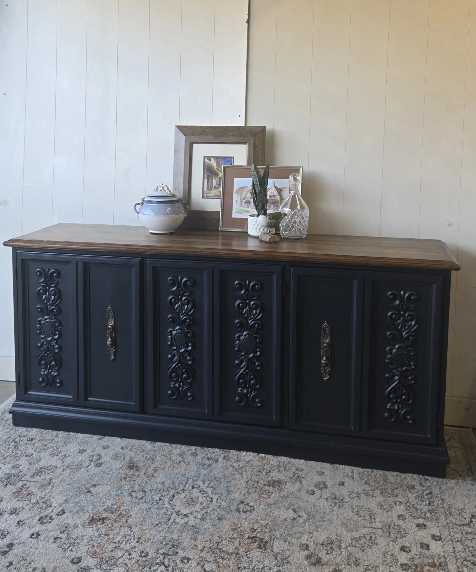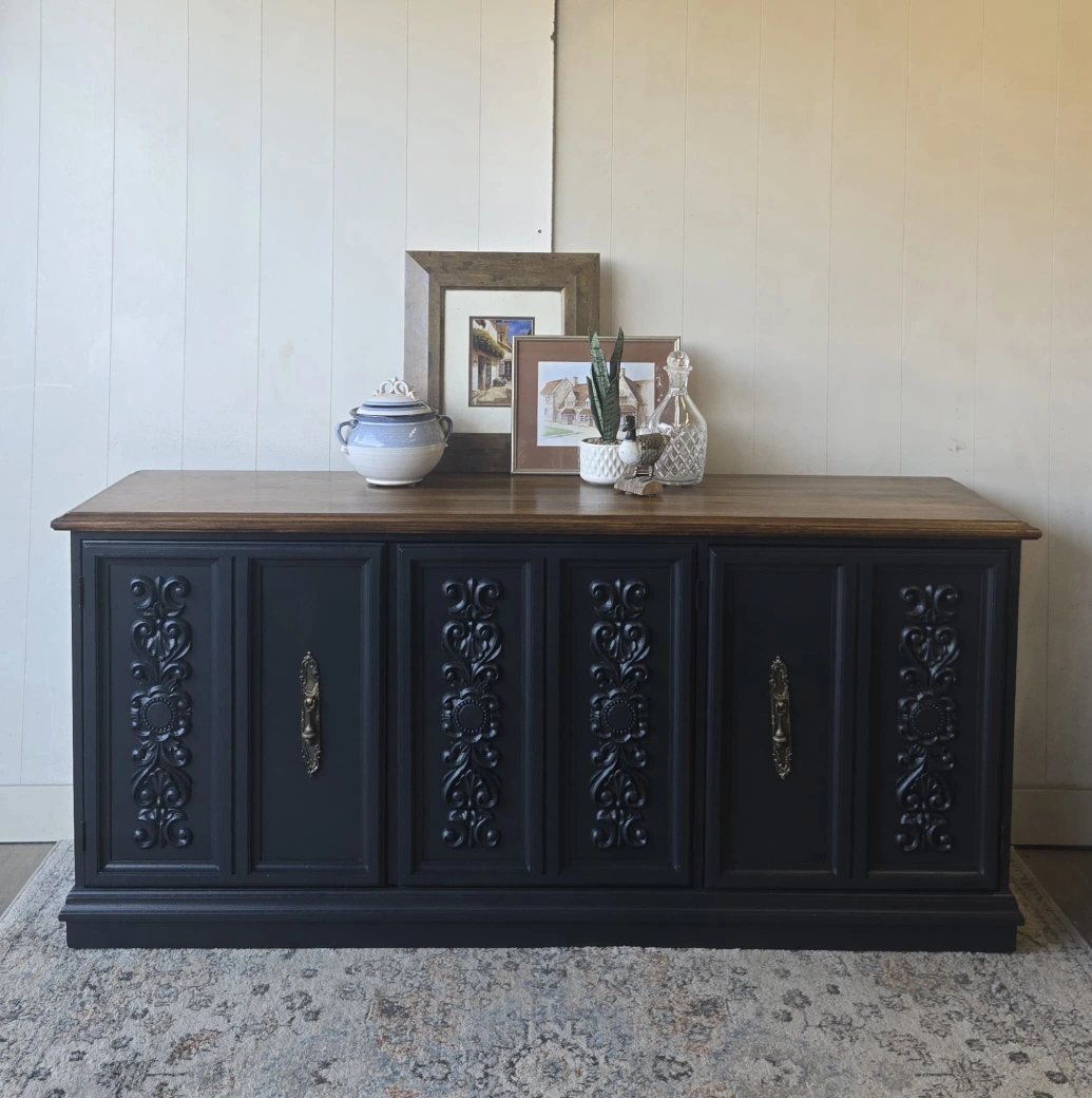 65This lovely elegant detailed sideboard is painted with Black Satin by Benjamin Moore. The top had been sanded down and stained with Antique Walnut by General Finishes and Expresso by Saman. Top coated with Minwax clear coat for added durability. 📏Dimensions 66" Length 18" Depth 30.5" Height 🌟If you would like to come and view this piece, let me know, and we can set up a time!🌟 • First come, first serve • These pieces sell fast! • If you would like to hold this piece, a deposit is required 📸 Videos and photos are unedited 🛻 Delivery is available within Calgary for a fee. Pick up in Cougar Ridge, Calgary 🎨Touch-up paint provided Follow our Instagram for more refinished pieces! Inquire if you would like a custom piece! @refinishedstudio