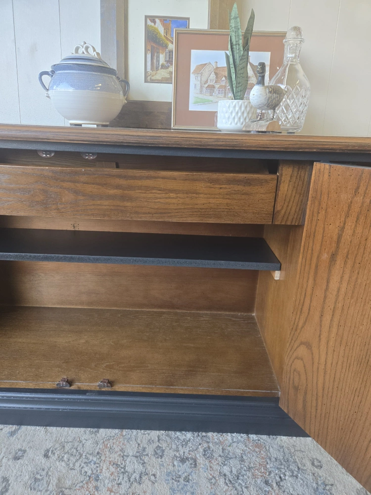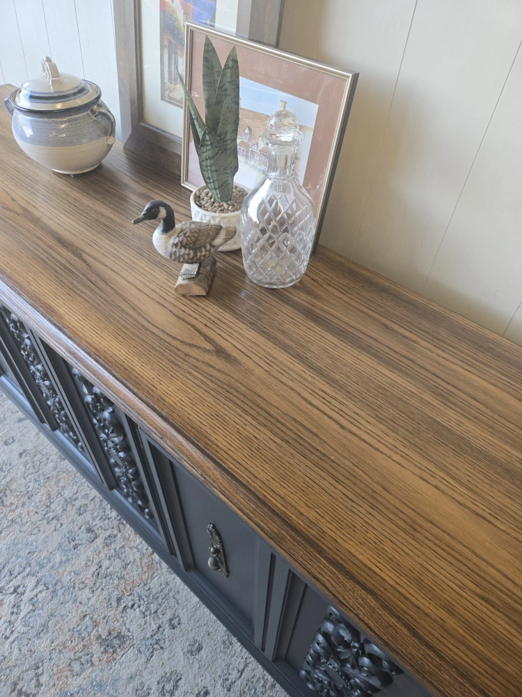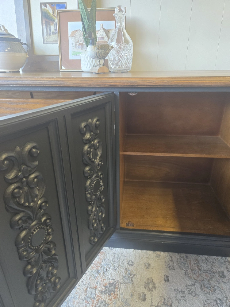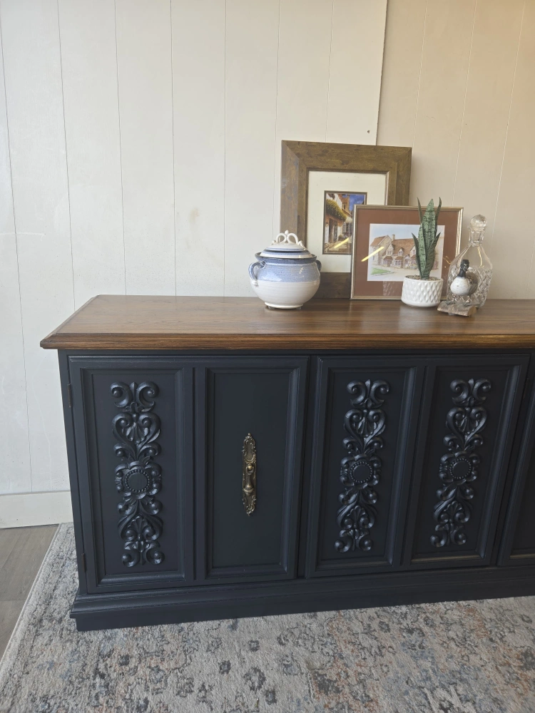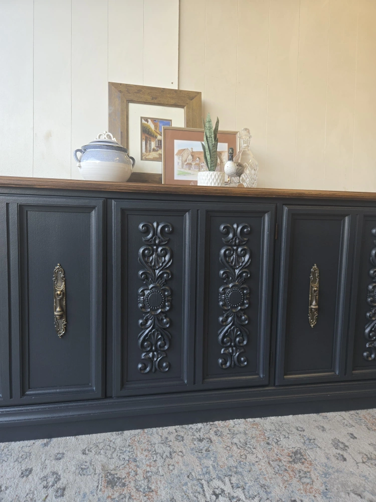65This lovely elegant detailed sideboard is painted with Black Satin by Benjamin Moore. The top had been sanded down and stained with Antique Walnut by General Finishes and Expresso by Saman. Top coated with Minwax clear coat for added durability. 📏Dimensions 66" Length 18" Depth 30.5" Height 🌟If you would like to come and view this piece, let me know, and we can set up a time!🌟 • First come, first serve • These pieces sell fast! • If you would like to hold this piece, a deposit is required 📸 Videos and photos are unedited 🛻 Delivery is available within Calgary for a fee. Pick up in Cougar Ridge, Calgary 🎨Touch-up paint provided Follow our Instagram for more refinished pieces! Inquire if you would like a custom piece! @refinishedstudio