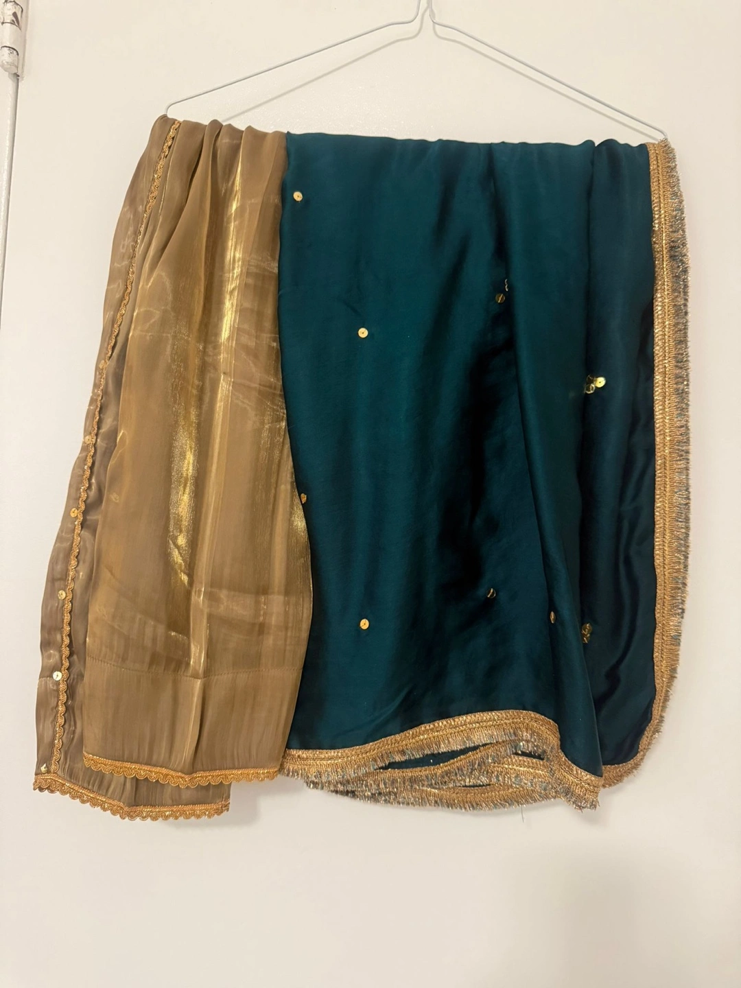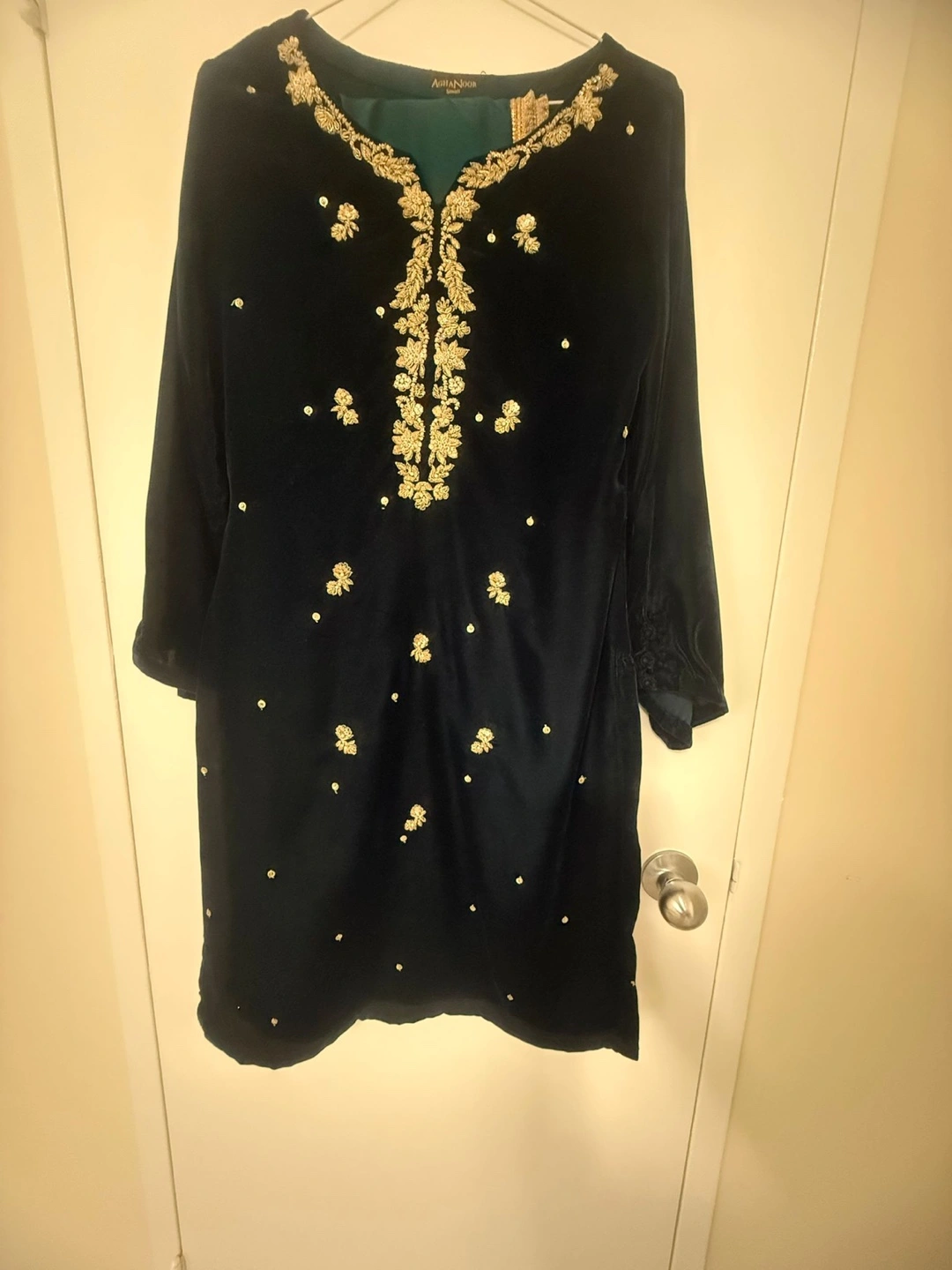 Beautiful teal velvet kameez with gold embroidery. Matching teal and gold dupatta. Three-quarter sleeves. Elegant and festive. Perfect for weddings or special occasions.