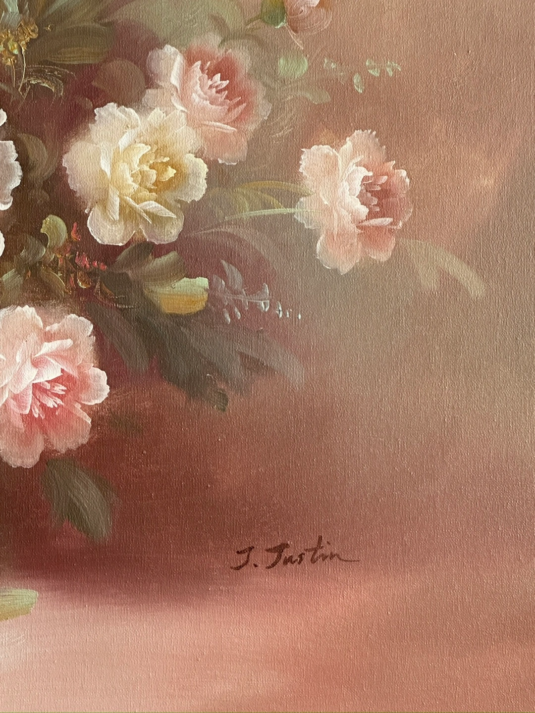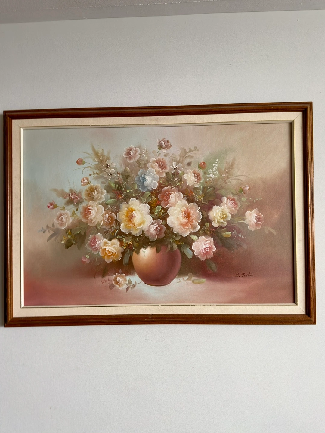 Gorgeous vintage flowers large oil painting by Canadian artist.